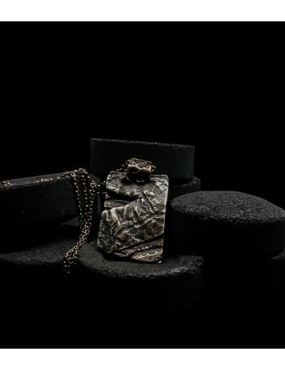 Unicité renforcée par la patine noircie appliquée sur l'argent 925/1000 qui s'estompe peu à peu avec le temps. Vivant, le bijou révèlera des zones où l'aspect brillant du métal reprendra ses droits.