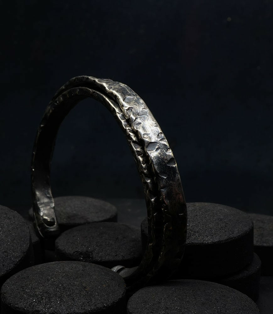 L'argent au titre légal 925/1000 subit un traitement brutal, rude, le résultat après polissage des bagues, bracelets, colliers, bruts, singuliers et harmonieux.
