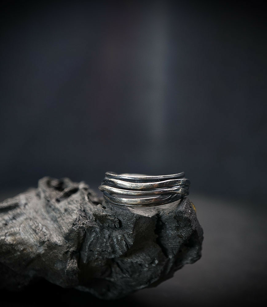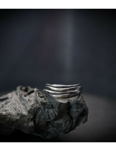 L'argent au titre légal 925/1000 subit un traitement brutal, rude, le résultat après polissage des bagues, bracelets, colliers, bruts, singuliers et harmonieux.