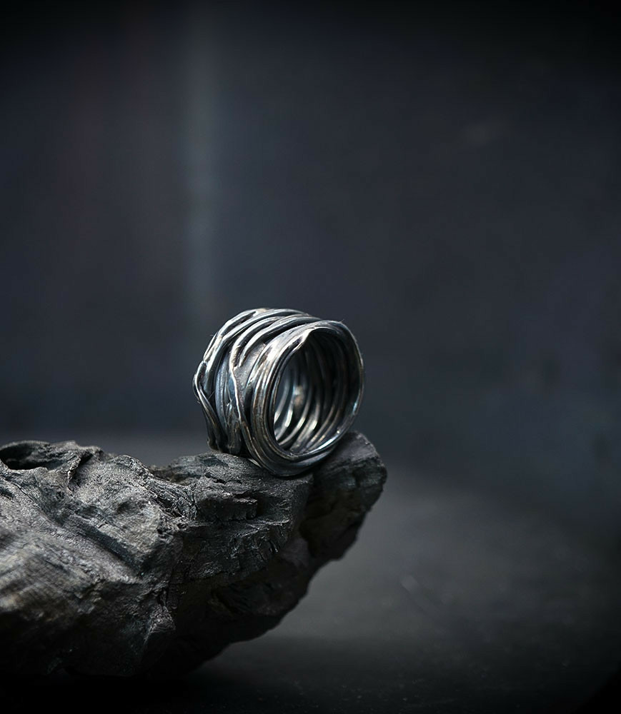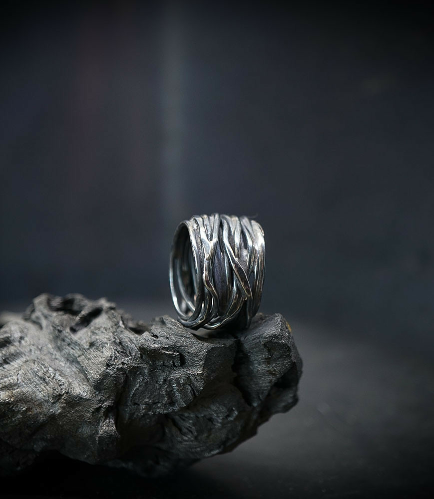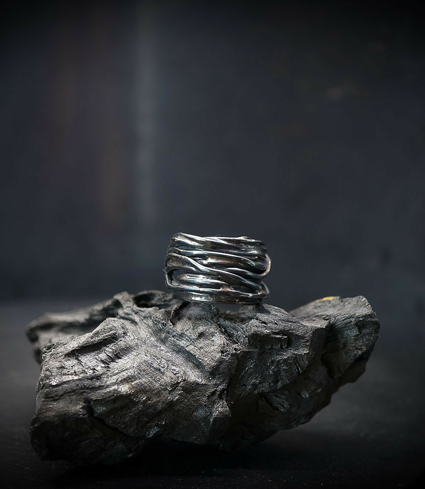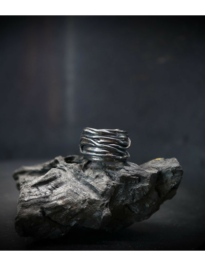 L'argent au titre légal 925/1000 subit un traitement brutal, rude, le résultat après polissage des bagues, bracelets, colliers, bruts, singuliers et harmonieux.