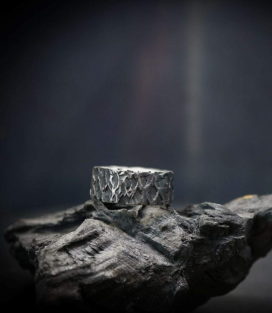 L'argent au titre légal 925/1000 subit un traitement brutal, rude, le résultat après polissage des bagues, bracelets, colliers, bruts, singuliers et harmonieux.