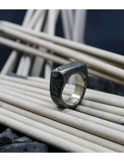L'argent au titre légal 925/1000 subit un traitement brutal, rude, le résultat après polissage des bagues, bracelets, colliers, bruts, singuliers et harmonieux.