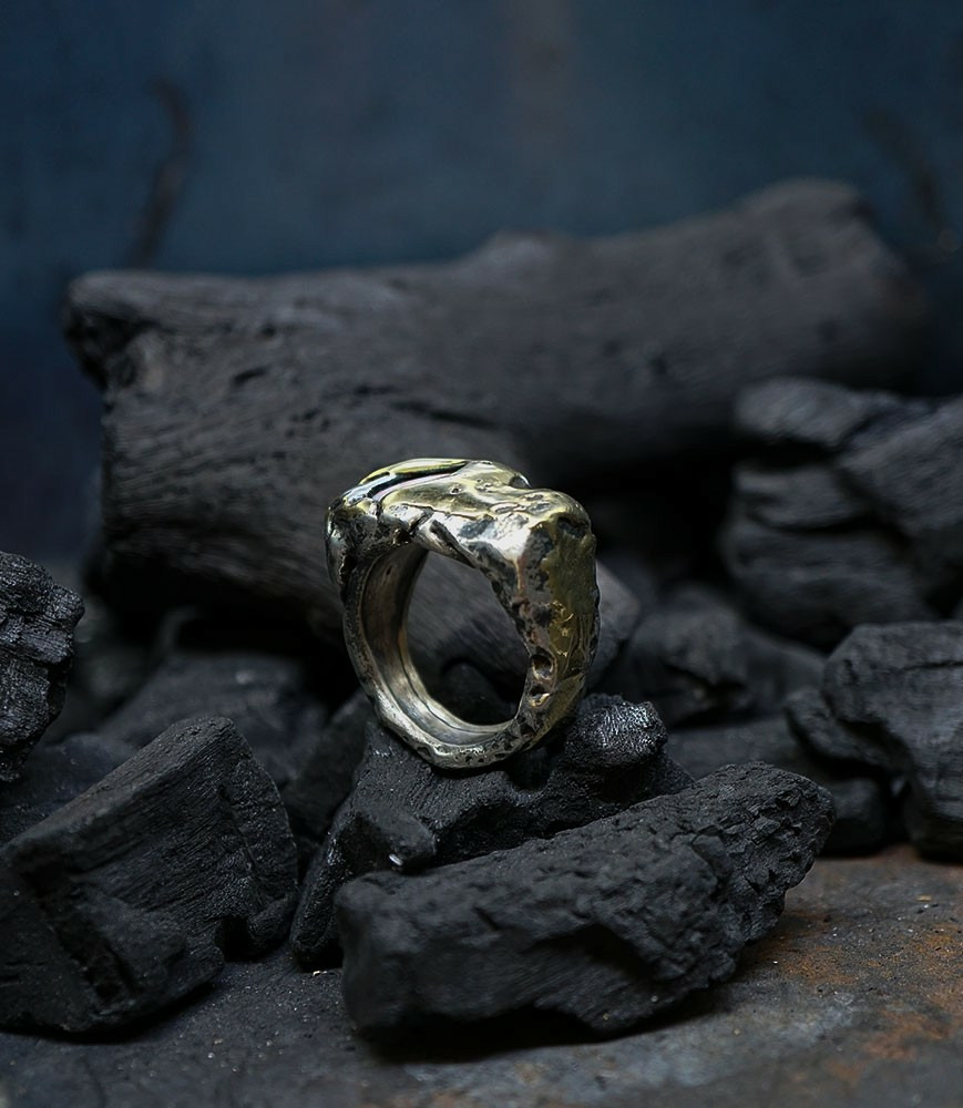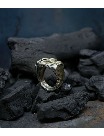 L'argent au titre légal 925/1000 subit un traitement brutal, rude, le résultat après polissage des bagues, bracelets, colliers, bruts, singuliers et harmonieux.