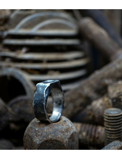 L'argent au titre légal 925/1000 subit un traitement brutal, rude, le résultat après polissage des bagues, bracelets, colliers, bruts, singuliers et harmonieux.