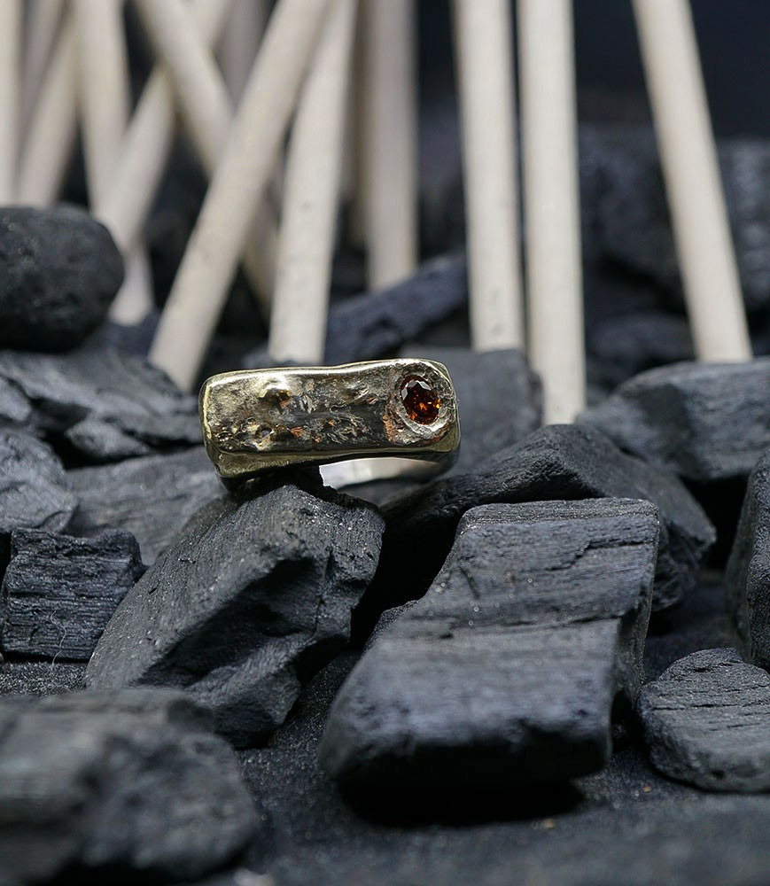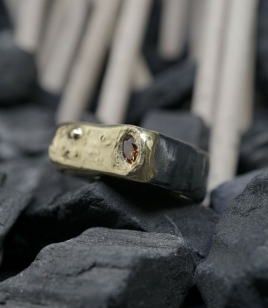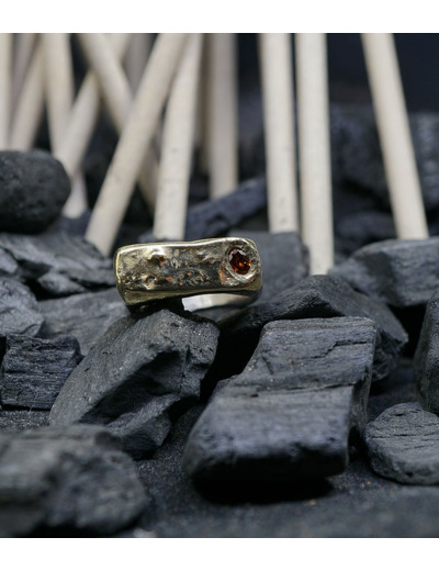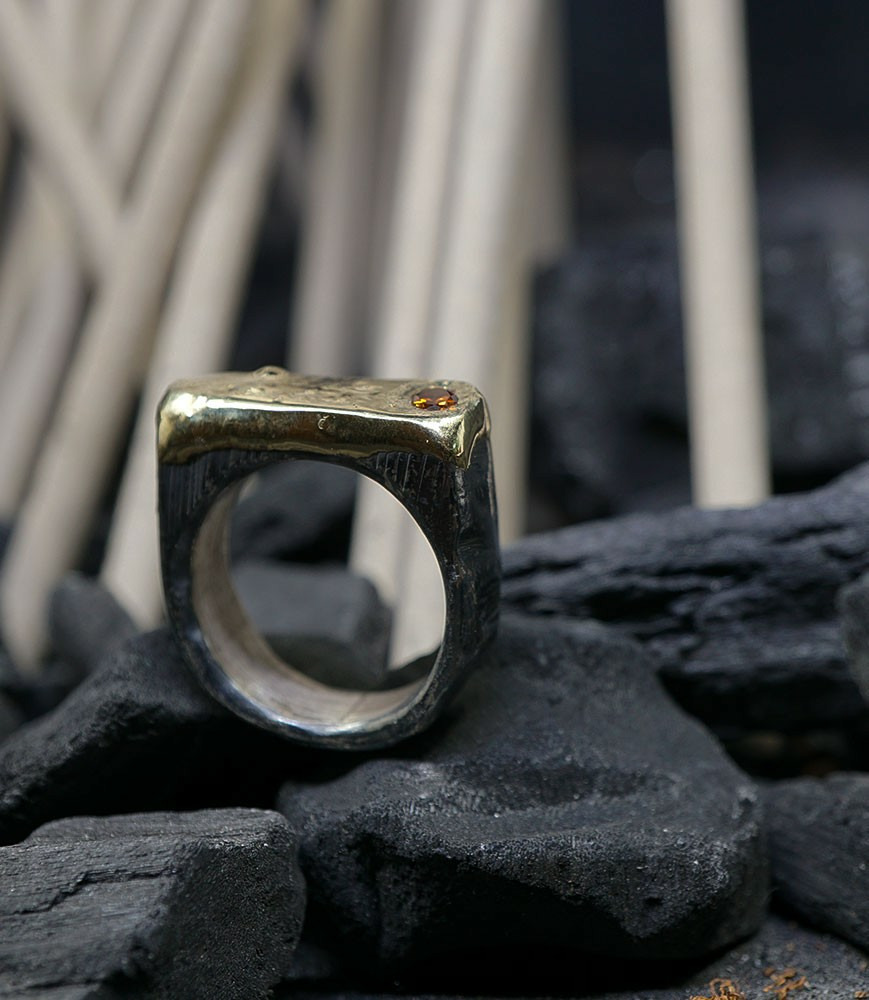 L'argent au titre légal 925/1000 subit un traitement brutal, rude, le résultat après polissage des bagues, bracelets, colliers, bruts, singuliers et harmonieux.