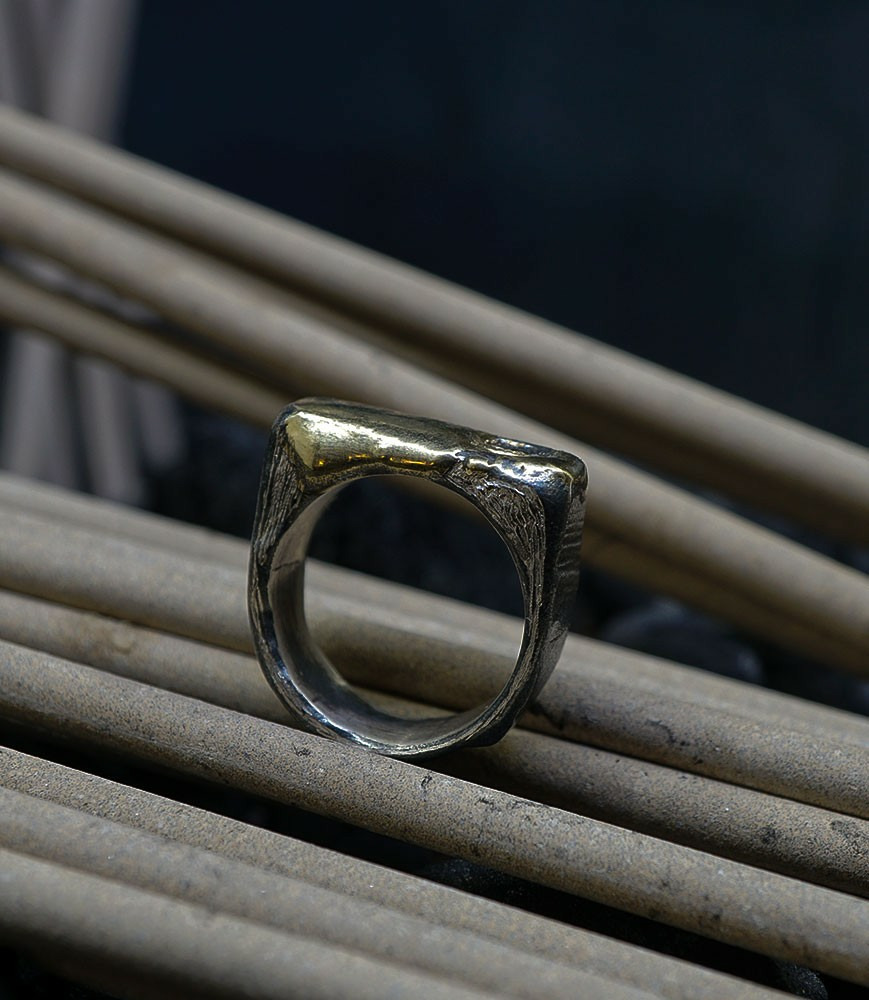 L'argent au titre légal 925/1000 subit un traitement brutal, rude, le résultat après polissage des bagues, bracelets, colliers, bruts, singuliers et harmonieux.
