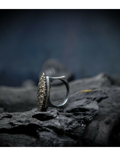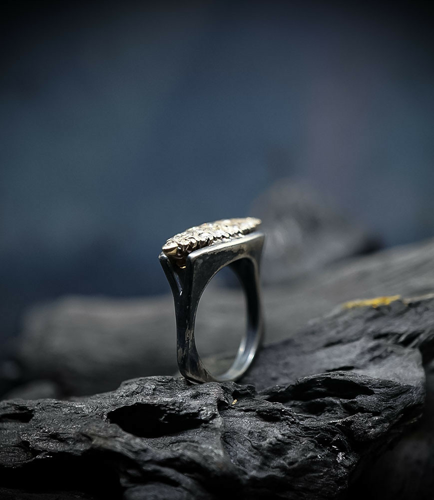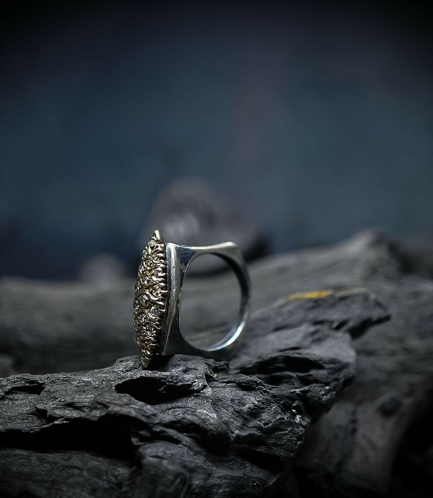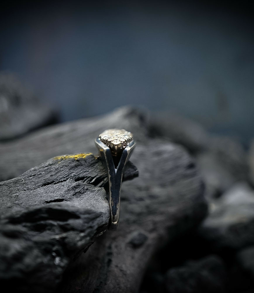 L'argent au titre légal 925/1000 subit un traitement brutal, rude, le résultat après polissage des bagues, bracelets, colliers, bruts, singuliers et harmonieux.