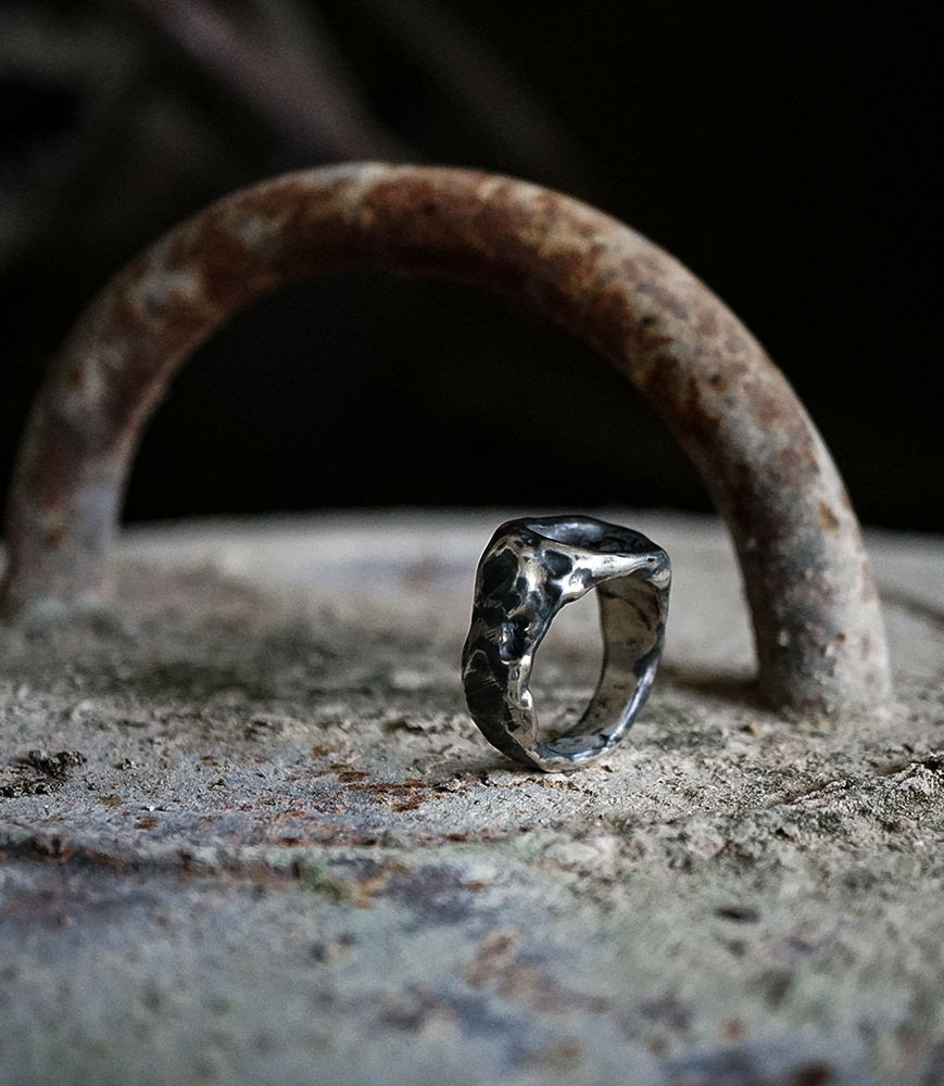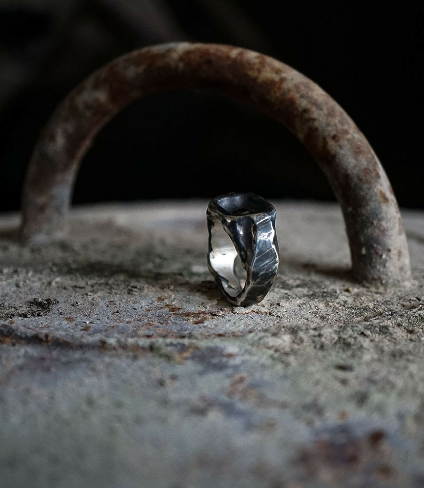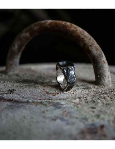 L'argent au titre légal 925/1000 subit un traitement brutal, rude, le résultat après polissage des bagues, bracelets, colliers, bruts, singuliers et harmonieux.