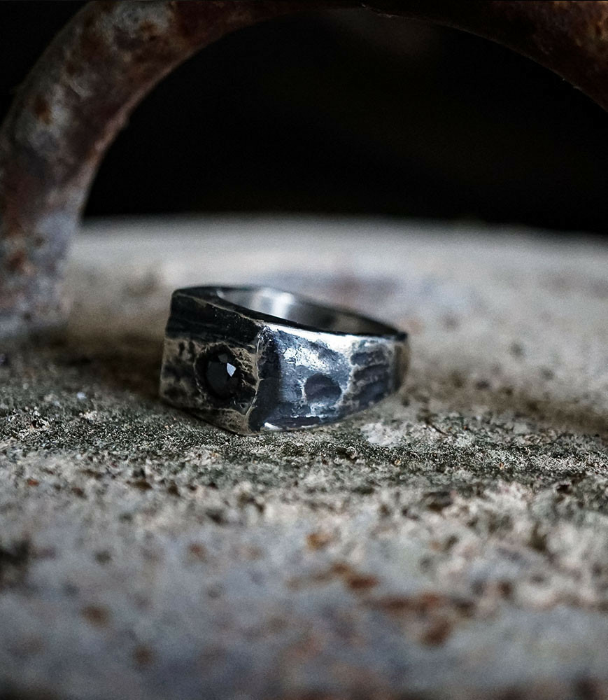 L'argent au titre légal 925/1000 subit un traitement brutal, rude, le résultat après polissage des bagues, bracelets, colliers, bruts, singuliers et harmonieux.