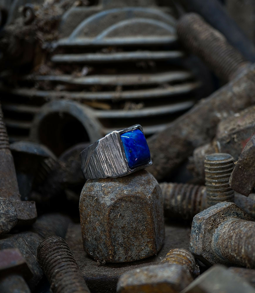 L'argent au titre légal 925/1000 subit un traitement brutal, rude, le résultat après polissage des bagues, bracelets, colliers, bruts, singuliers et harmonieux.