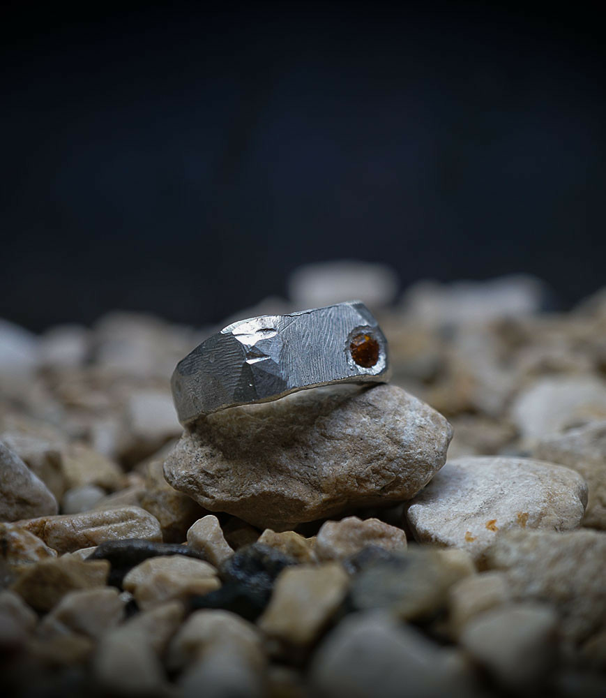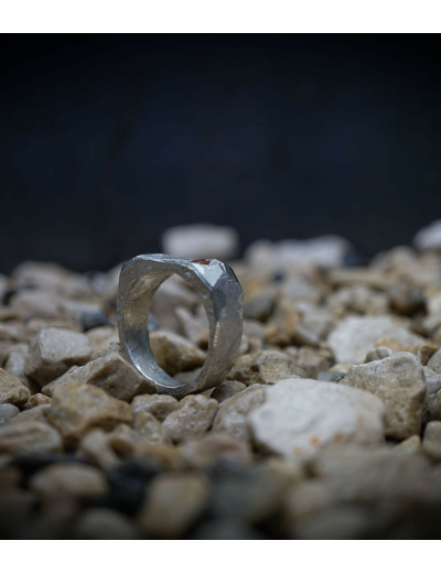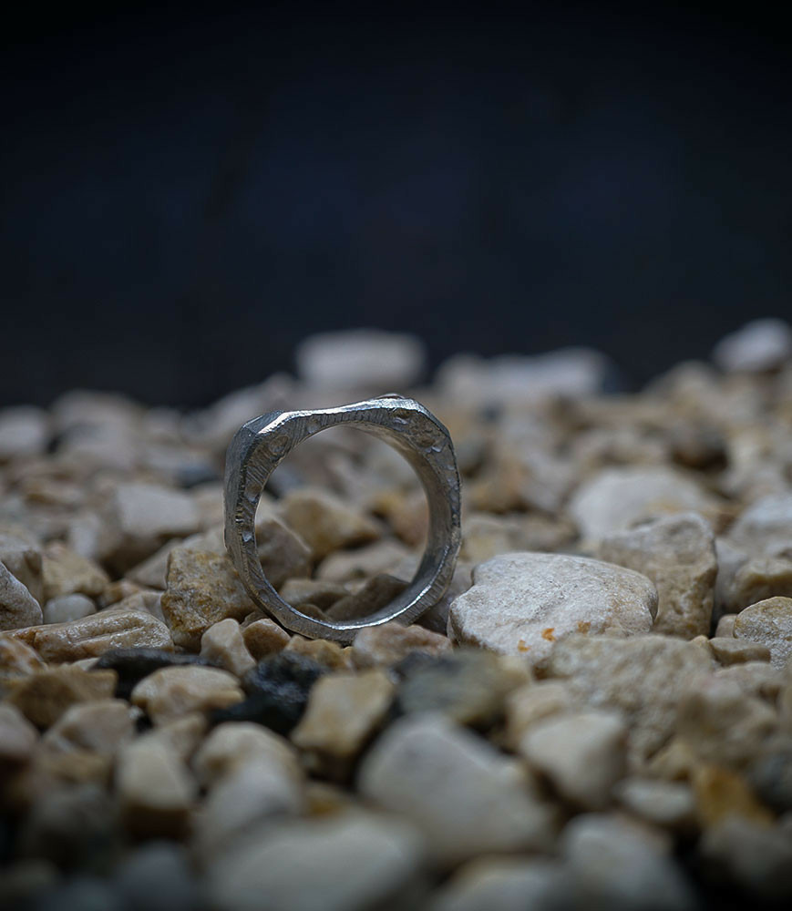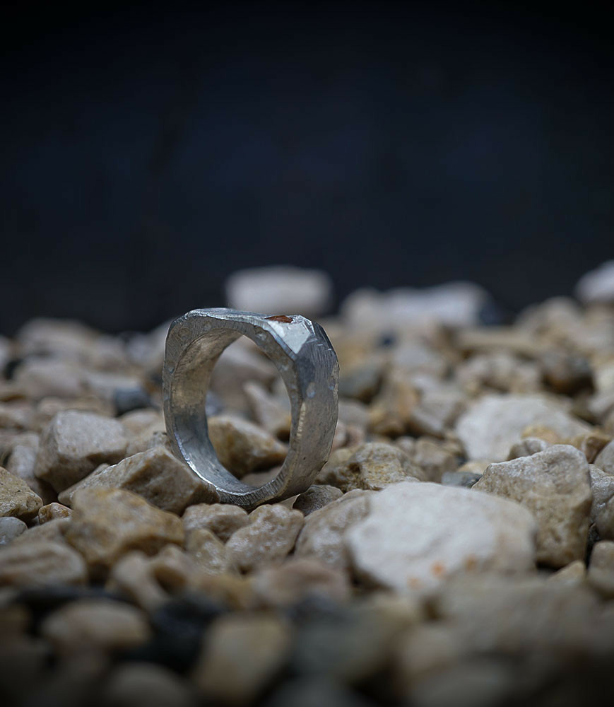 L'argent au titre légal 925/1000 subit un traitement brutal, rude, le résultat après polissage des bagues, bracelets, colliers, bruts, singuliers et harmonieux.