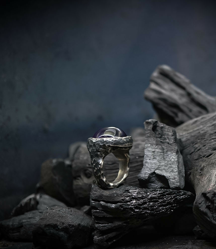 L'argent au titre légal 925/1000 subit un traitement brutal, rude, le résultat après polissage des bagues, bracelets, colliers, bruts, singuliers et harmonieux.