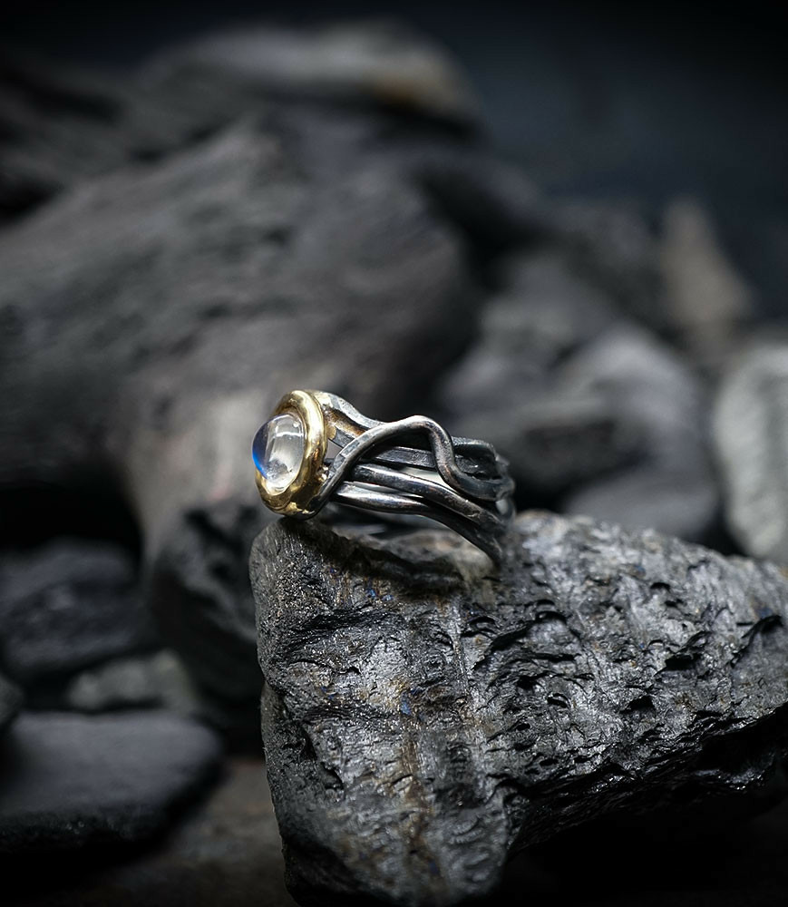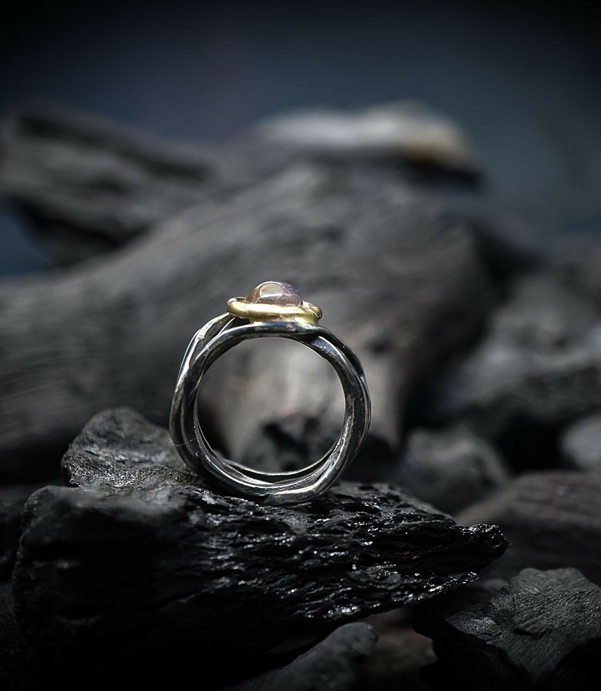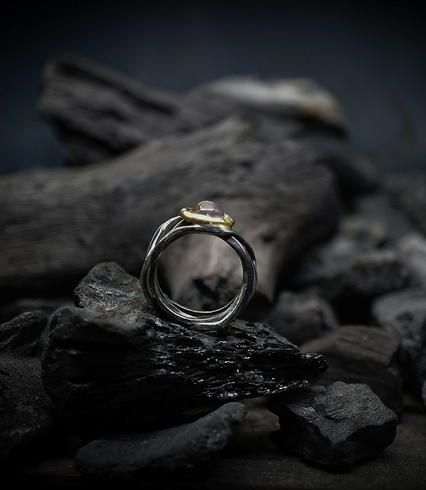 L'argent au titre légal 925/1000 subit un traitement brutal, rude, le résultat après polissage des bagues, bracelets, colliers, bruts, singuliers et harmonieux.