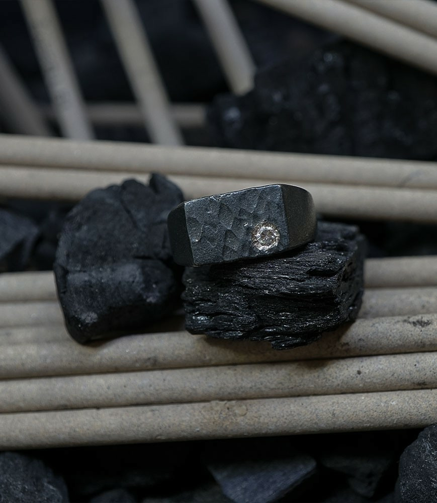 L'argent au titre légal 925/1000 subit un traitement brutal, rude, le résultat après polissage des bagues, bracelets, colliers, bruts, singuliers et harmonieux.