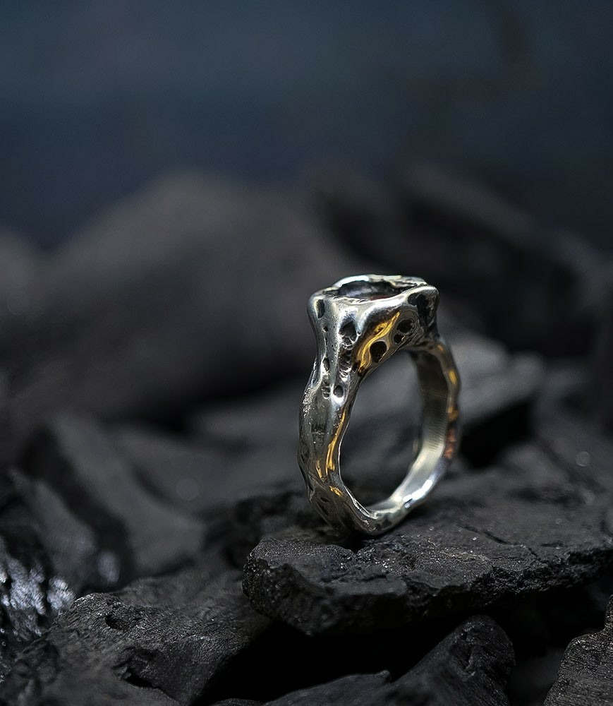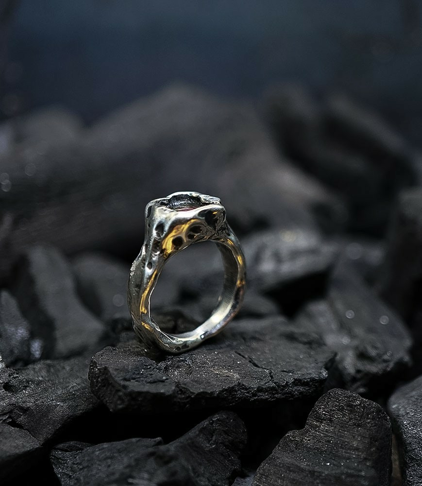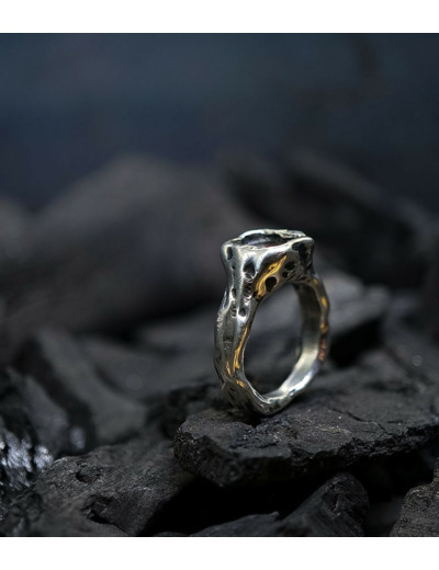 L'argent au titre légal 925/1000 subit un traitement brutal, rude, le résultat après polissage des bagues, bracelets, colliers, bruts, singuliers et harmonieux.