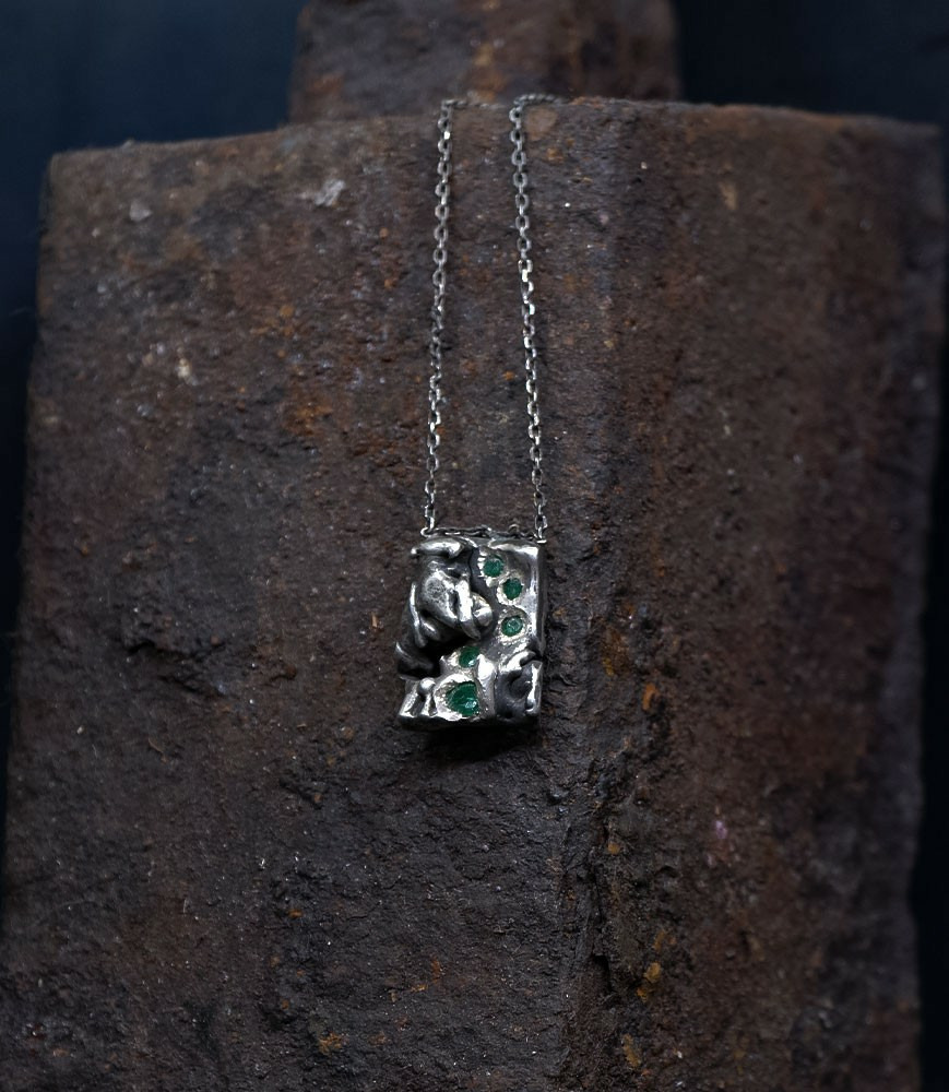 Unicité renforcée par la patine noircie appliquée sur l'argent 925/1000 qui s'estompe peu à peu avec le temps. Vivant, le bijou révèlera des zones où l'aspect brillant du métal reprendra ses droits.