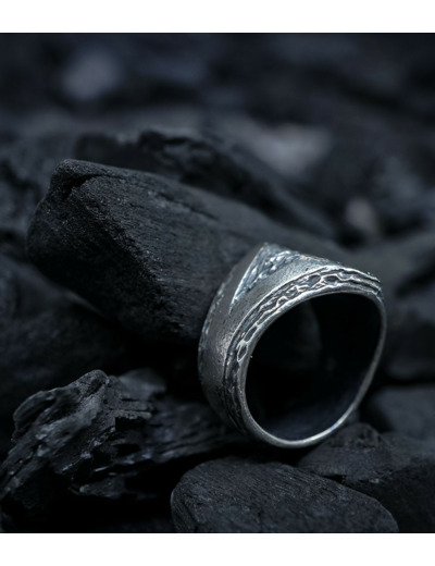 L'argent au titre légal 925/1000 subit un traitement brutal, rude, le résultat après polissage des bagues, bracelets, colliers, bruts, singuliers et harmonieux.