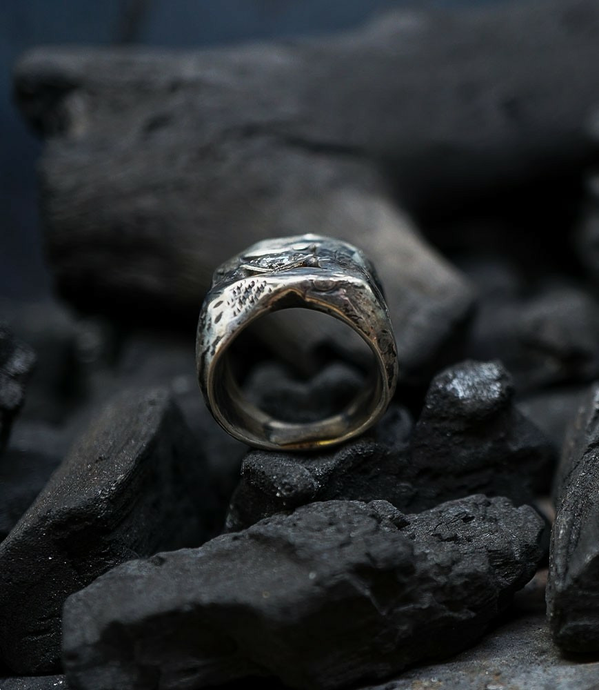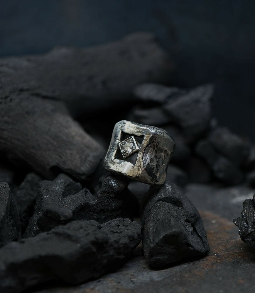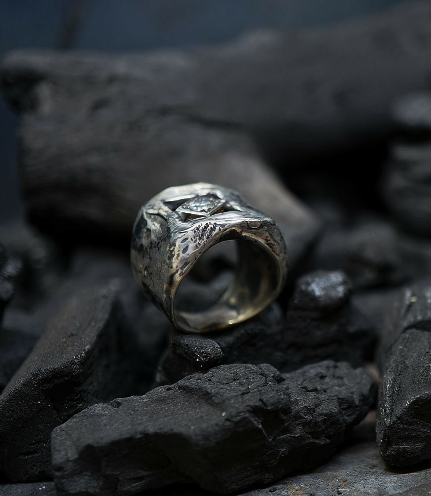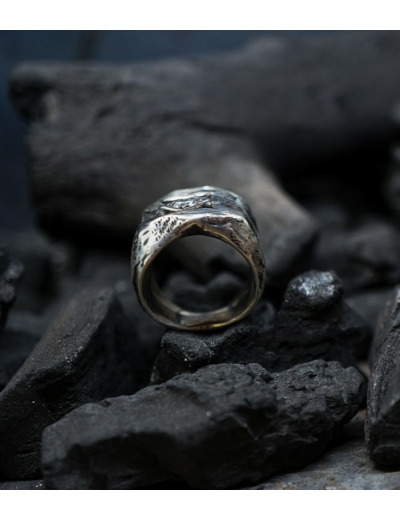 L'argent au titre légal 925/1000 subit un traitement brutal, rude, le résultat après polissage des bagues, bracelets, colliers, bruts, singuliers et harmonieux.