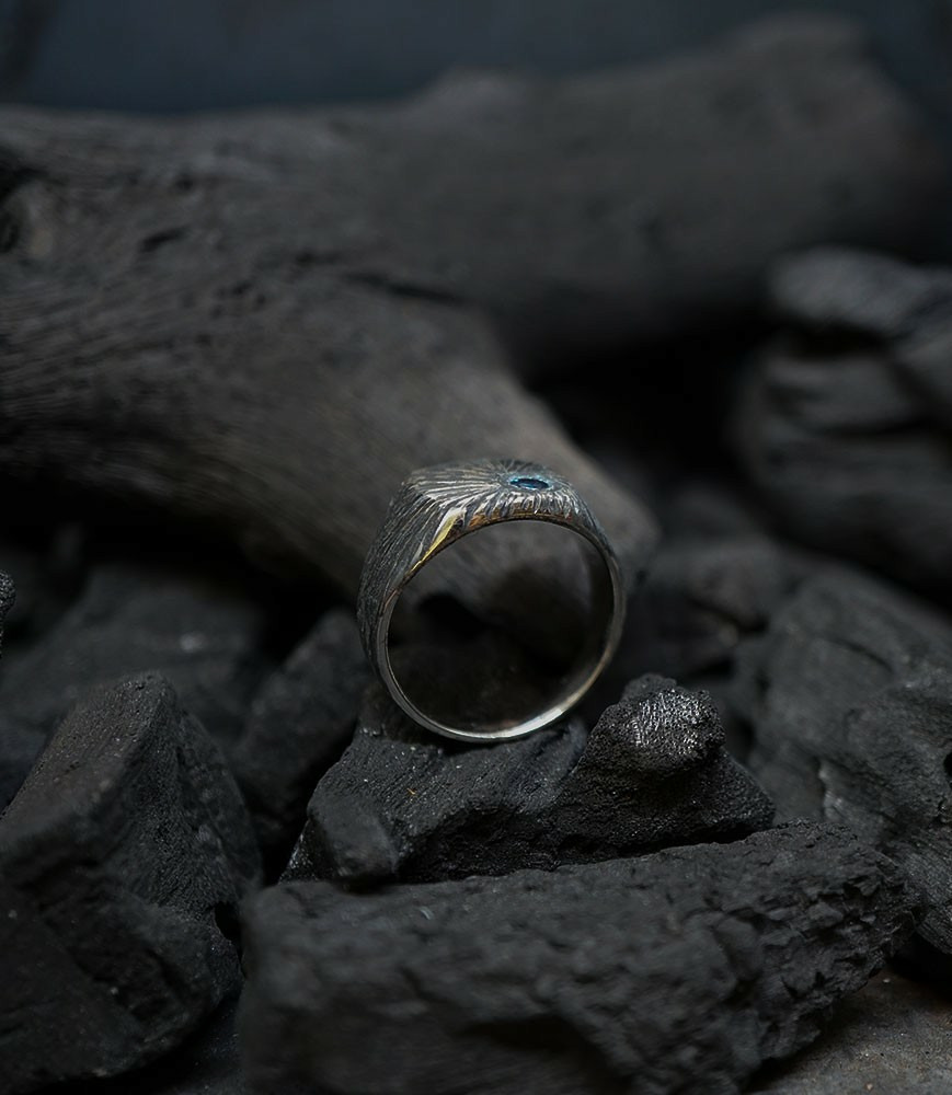 L'argent au titre légal 925/1000 subit un traitement brutal, rude, le résultat après polissage des bagues, bracelets, colliers, bruts, singuliers et harmonieux.