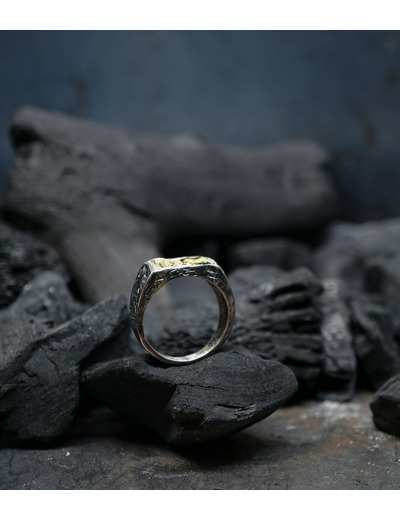 Unicité renforcée par la patine noircie appliquée sur l'argent 925/1000 qui s'estompe peu à peu avec le temps. Vivant, le bijou révèlera des zones où l'aspect brillant du métal reprendra ses droits.