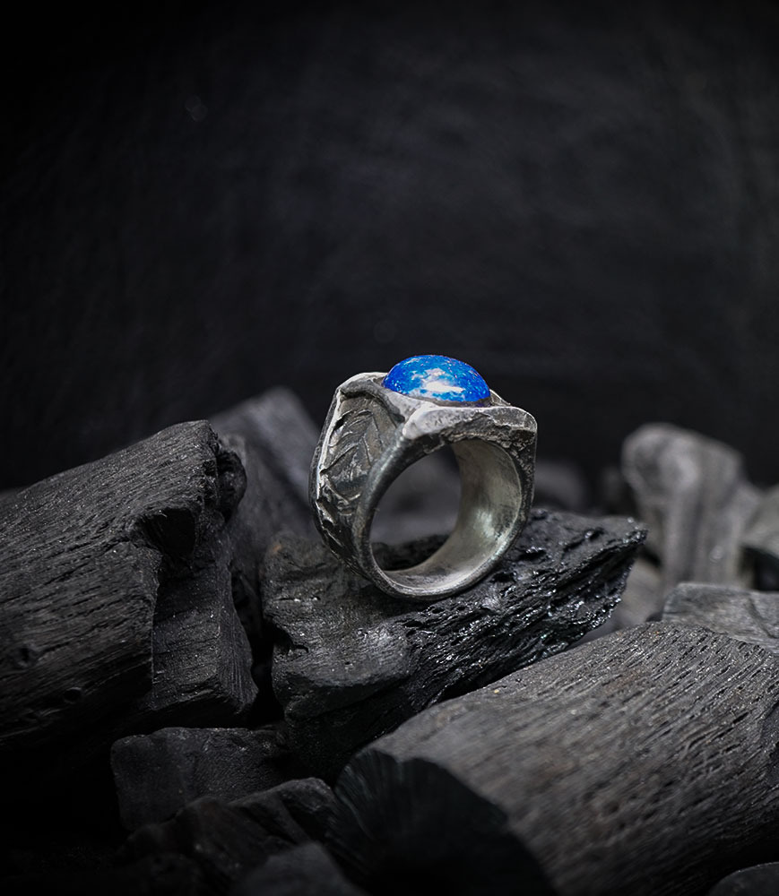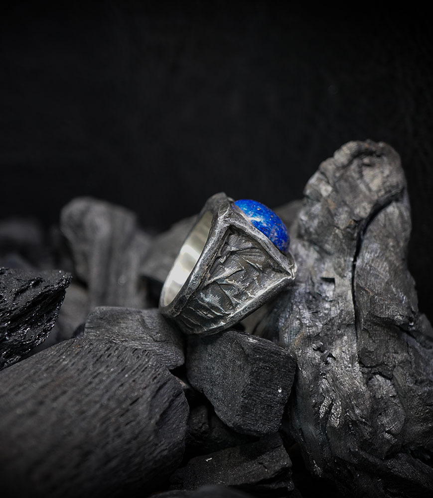 Le contraste entre le fini patiné de l'argent, qui lui donne un aspect vécu et une texture inimitable, et le bleu intense et énigmatique du Lapis Lazuli crée un équilibre parfait a la force brute.