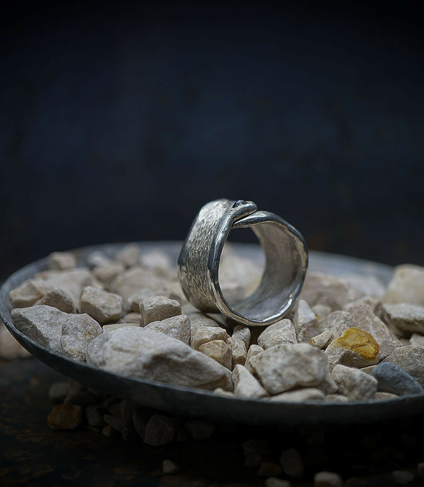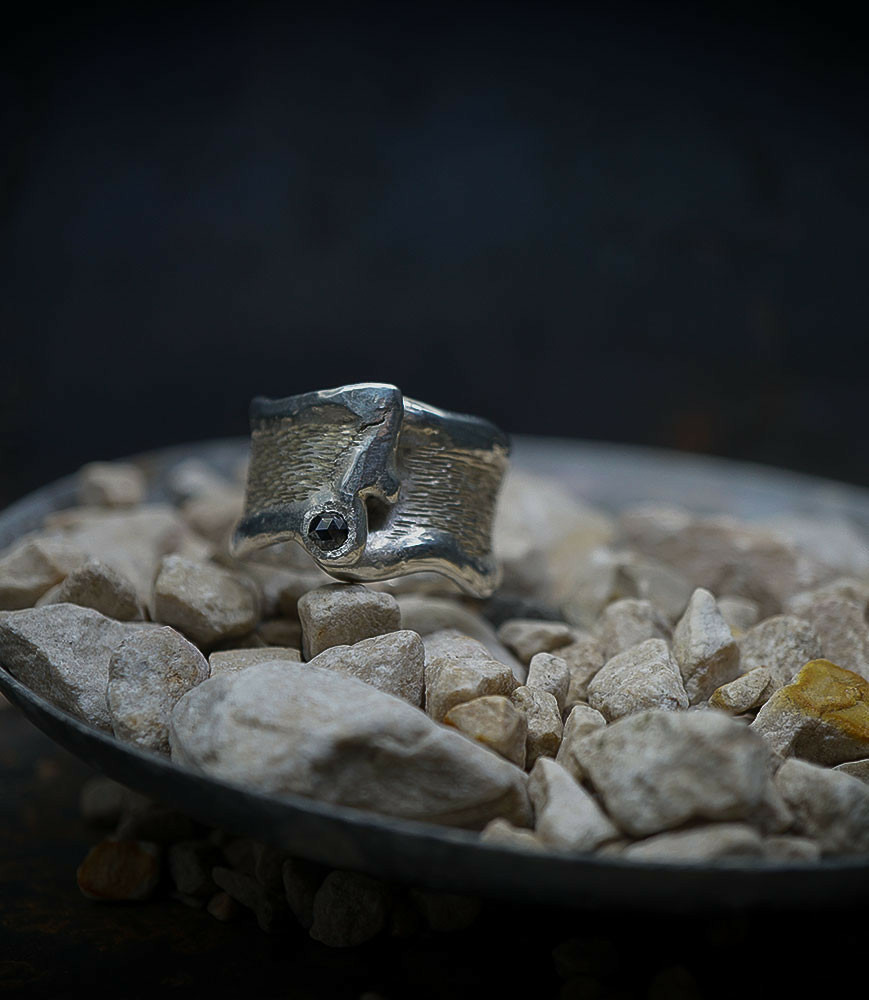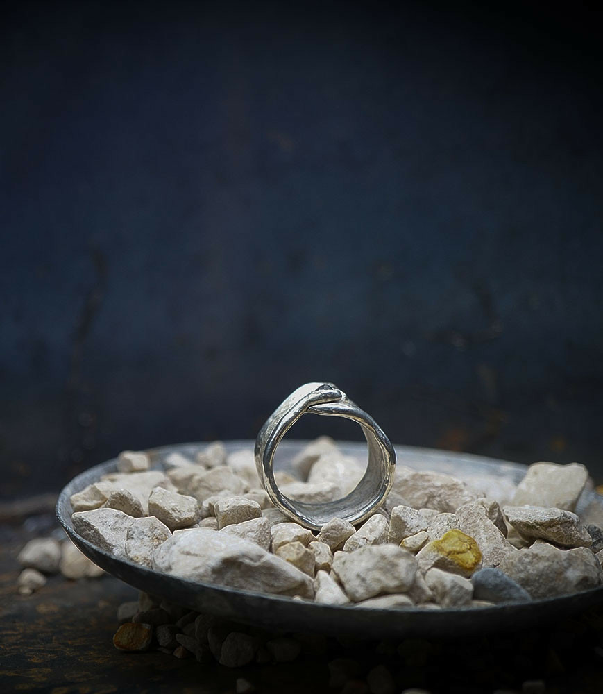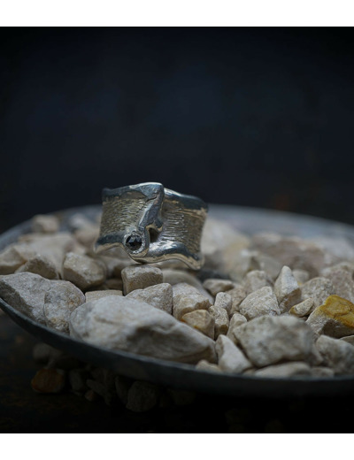 Valentine pour cette collection de bagues utilise une seule pièce d'argent au titre légal 925/1000 par création, qu'elle associe parfois à de la "côte de maille" en argent 925/1000. elle peut aussi sertir des pierres fines ou précieuses sur certaines pièces, en repliant simplement les bords de la bague sur le minéral.