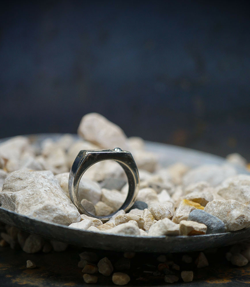 Parfois les stries dans le métal de la bague rappellent la superposition des couches sédimentaires géologiques que l'on peut observer dans les roches.