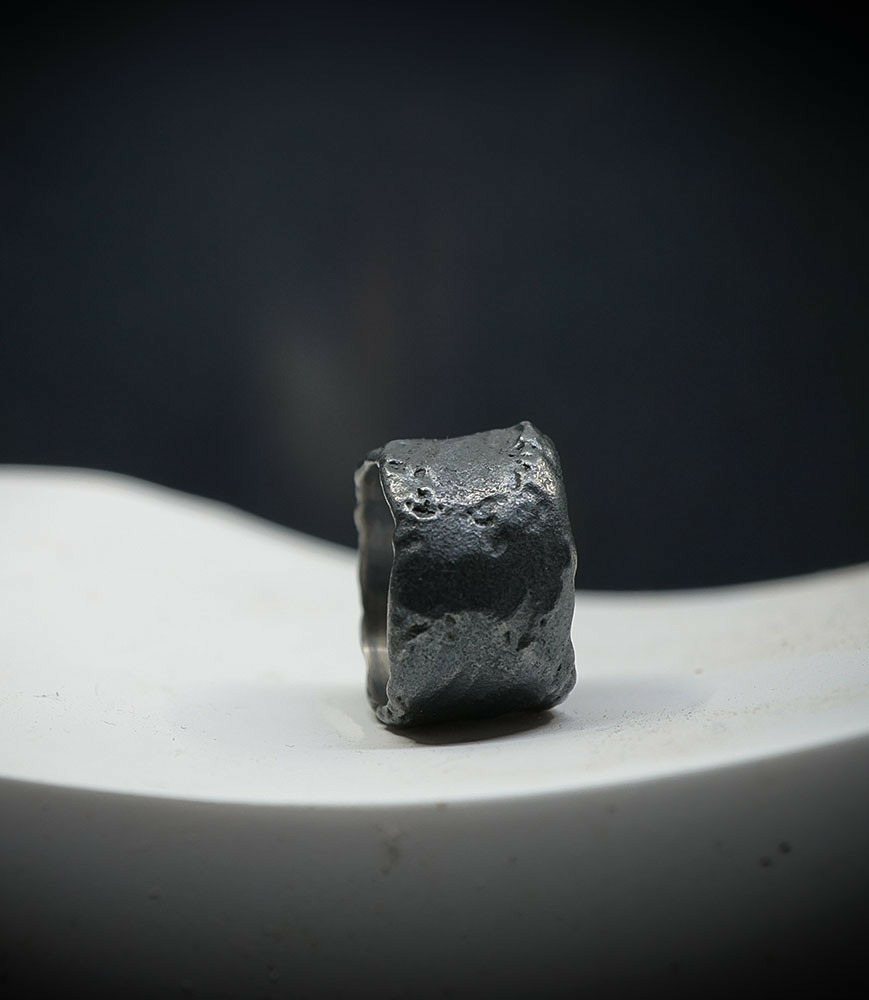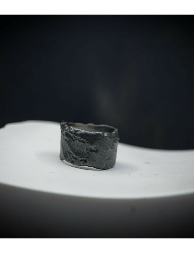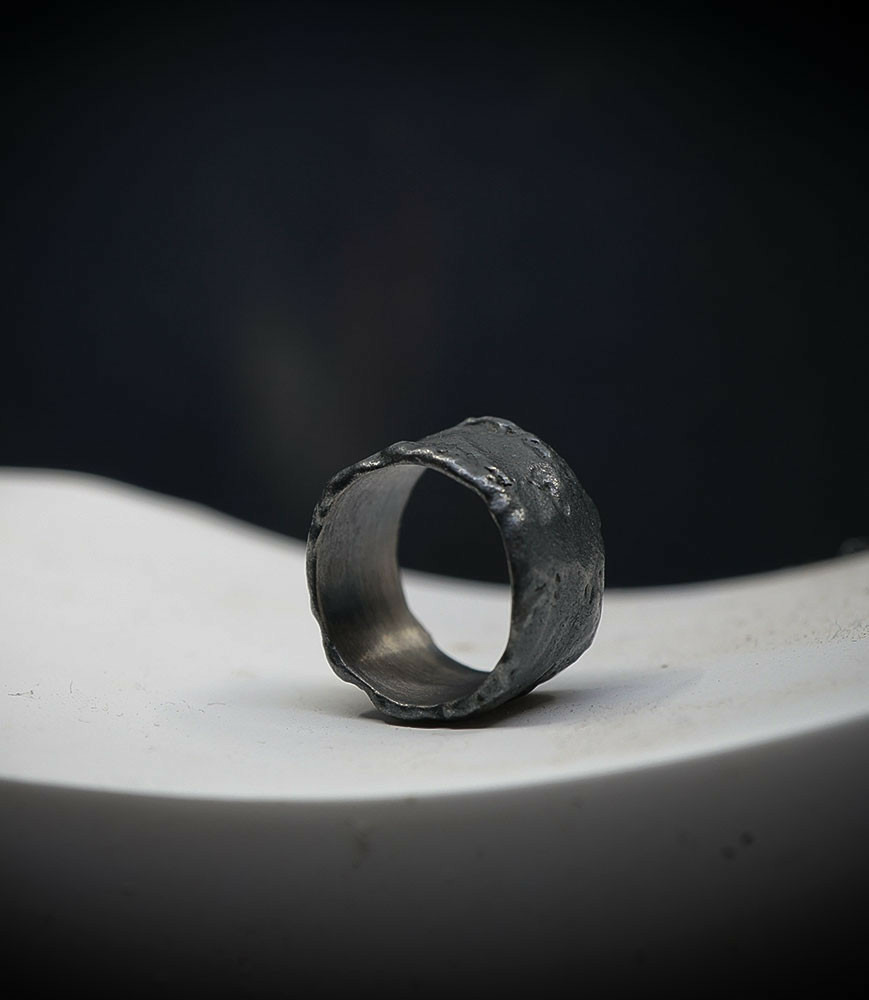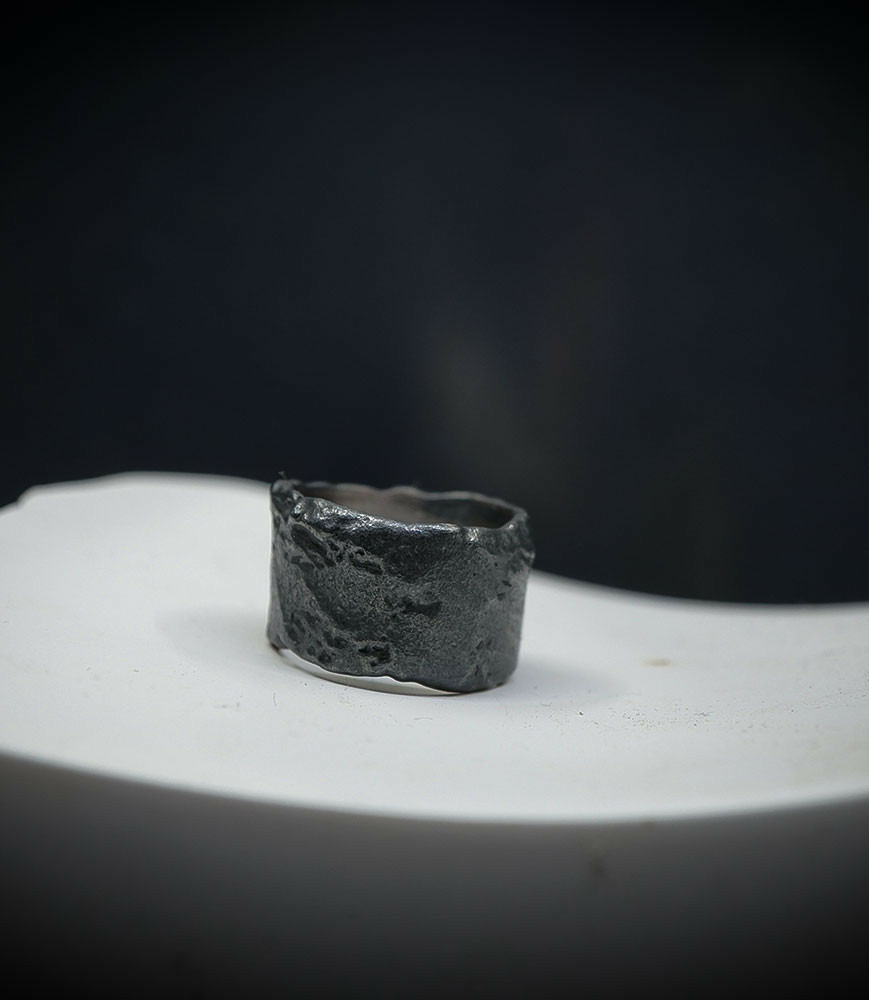 L'argent au titre légal 925/1000 subit un traitement brutal, rude, le résultat après polissage des bagues, bracelets, colliers, bruts, singuliers et harmonieux.