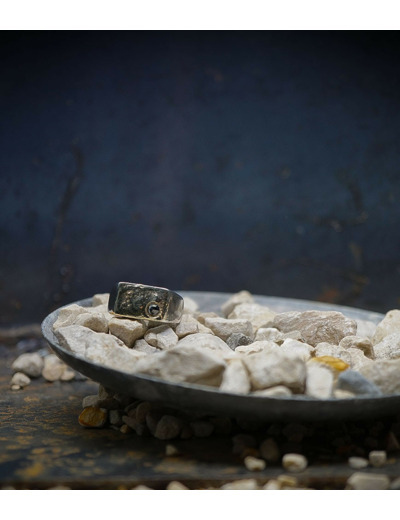 Parfois les stries dans le métal de la bague rappellent la superposition des couches sédimentaires géologiques que l'on peut observer dans les roches.