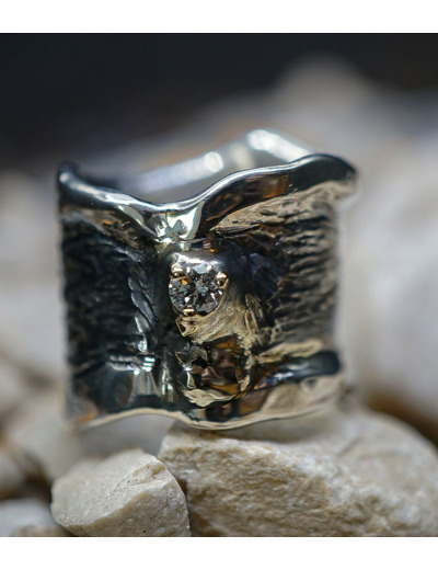 Valentine pour cette collection de bagues utilise une seule pièce d'argent au titre légal 925/1000 par création, qu'elle associe parfois à de la "côte de maille" en argent 925/1000. elle peut aussi sertir des pierres fines ou précieuses sur certaines pièces, en repliant simplement les bords de la bague sur le minéral.