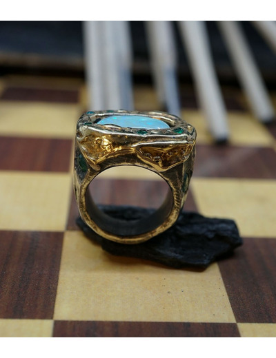 Au cœur de la bague, une opale blanche multicolore, taillée avec soin, tenue à tous les regards.