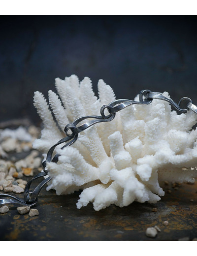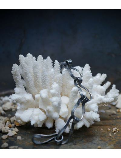 Unicité renforcée par la patine noircie appliquée sur l'argent 925/1000 qui s'estompe peu à peu avec le temps. Vivant, le bijou révèlera des zones où l'aspect brillant du métal reprendra ses droits.