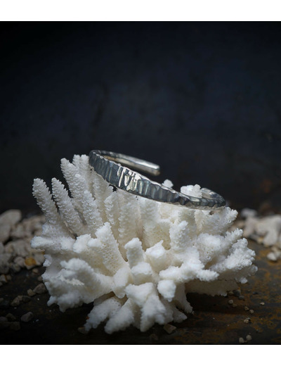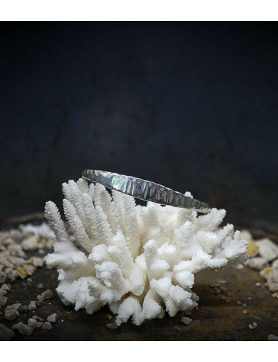 Design : Le bracelet est une manchette rigide, ouverte à l'arrière pour un ajustement confortable. La surface est minutieusement martelée à la main, donnant une texture unique et organique à chaque pièce.
