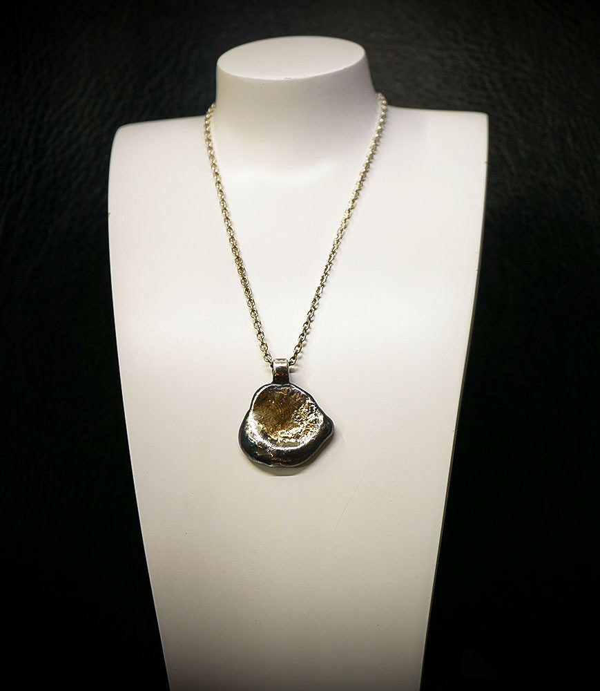 Chaque surface du pendentif capte la lumière différemment, révélant tantôt un éclat discret, tantôt une profondeur mate.