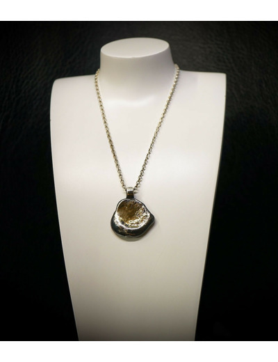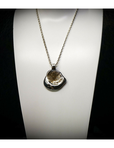 Ce pendentif élégant combine l’or et l’argent brut dans une forme organique évoquant un galet naturellement poli par les éléments.