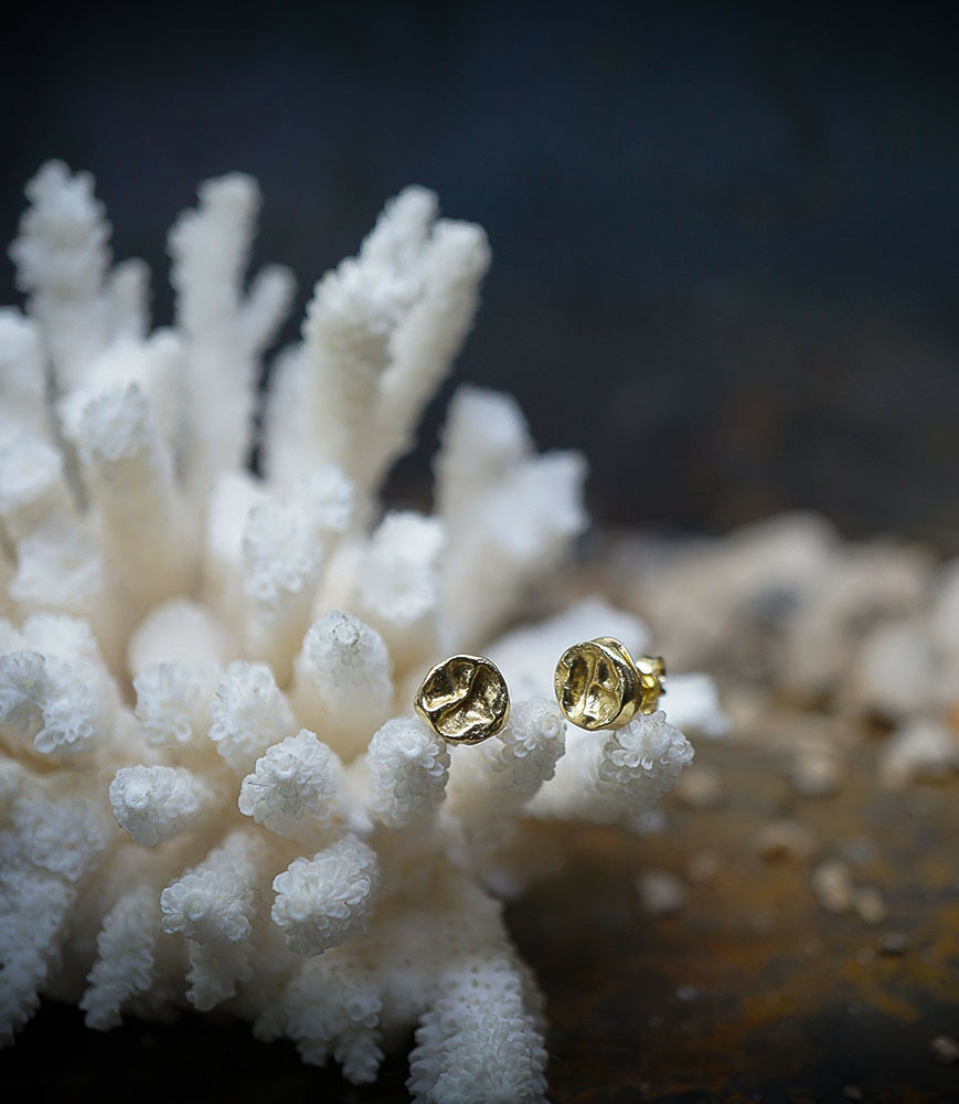 Elle travaille l'or et l'argent de manière organique, privilégiant des textures et des formes irrégulières, inspirées par la nature.