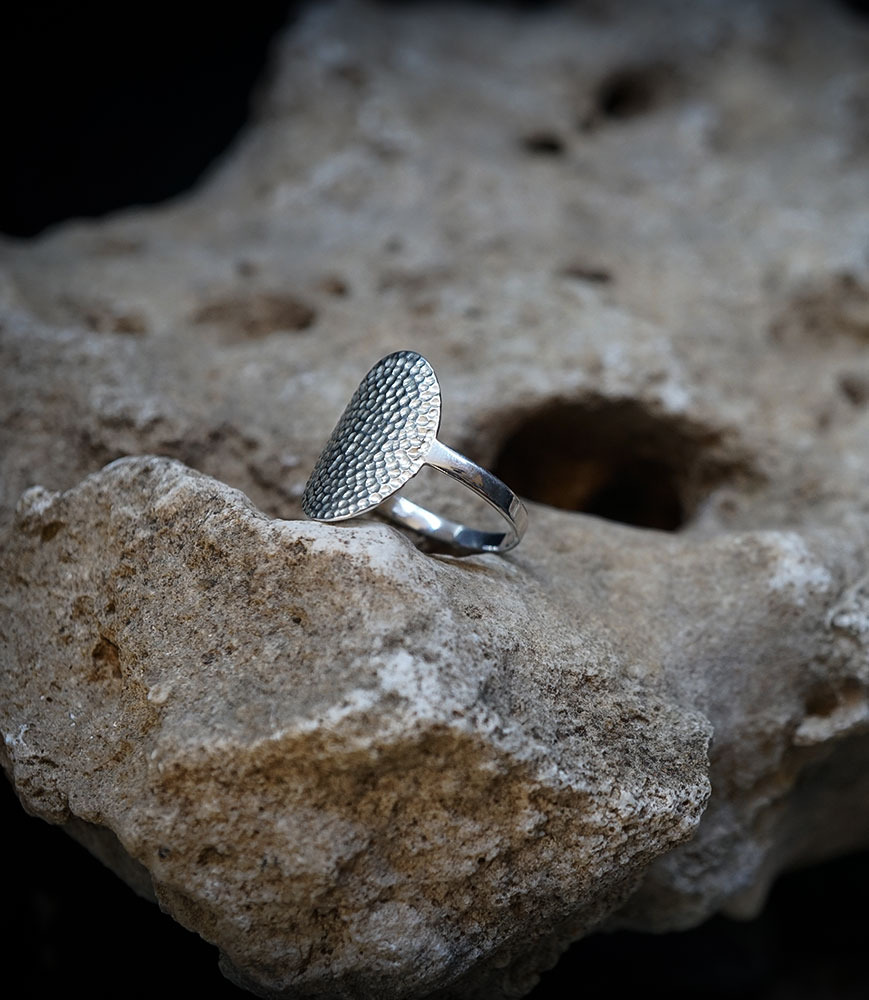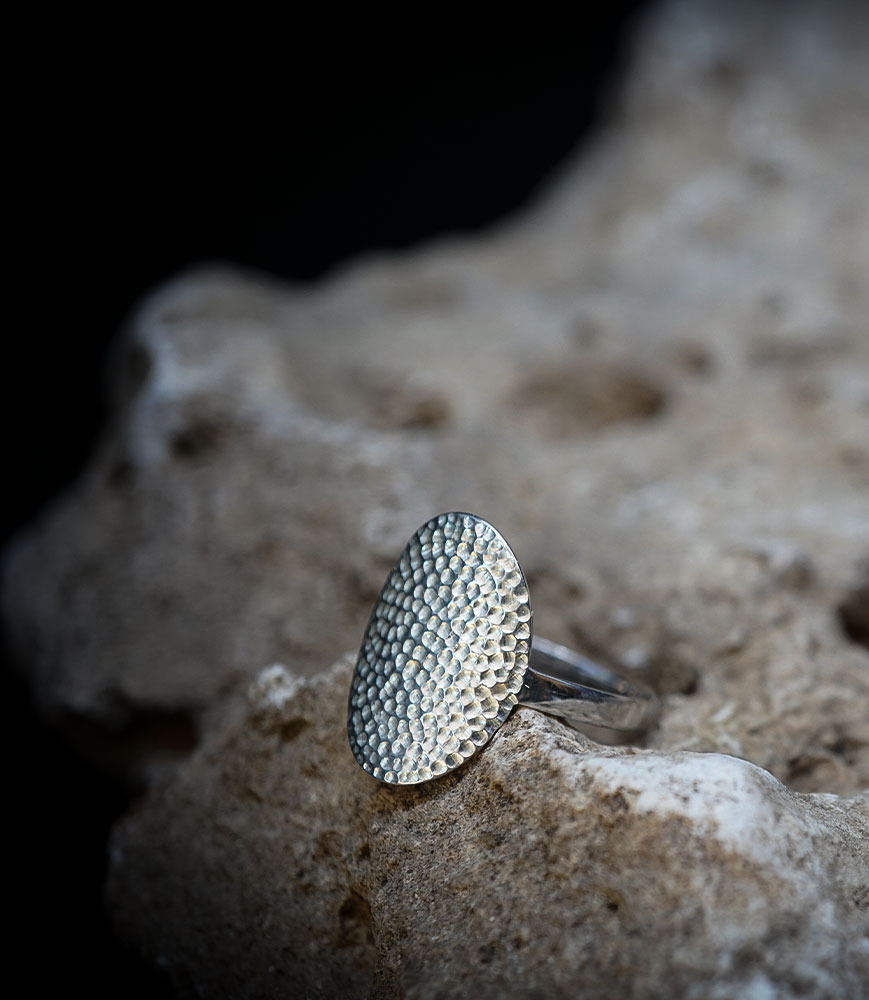 Ce martelage confère à l'argent un aspect texturé unique, irrégulier et vivant, qui accroche la lumière d'une manière singulière et met en valeur le caractère artisanal de la pièce.