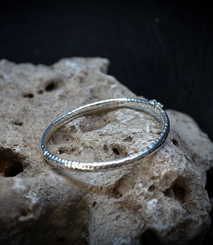 Découvrez le bracelet jonc martelet ouvrant créé par Valentine, une pièce maîtresse de sa marque de bijoux bruts, Lovely Storm. Ce bracelet incarne parfaitement l'esprit de la marque : une fusion audacieuse entre la force brute et l'élégance naturelle.