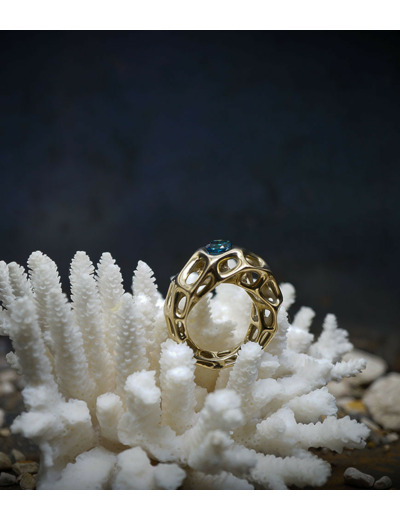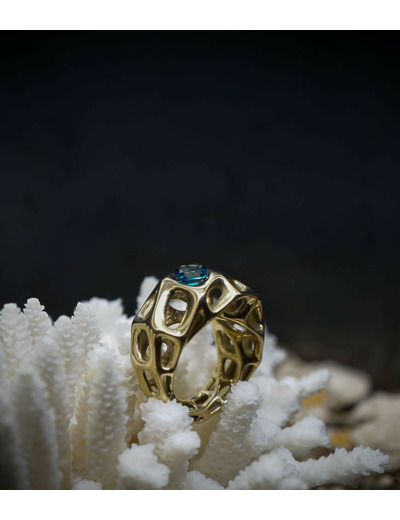 Le design elliptique de la bague offre une allure moderne et élégante. Ce qui rend cette bague particulière, c'est son motif ajouré en nid d'abeille. Cette technique de conception permet à la lumière de traverser la structure, créant des jeux de lumière captivants qui mettent en valeur l'éclat du saphir.