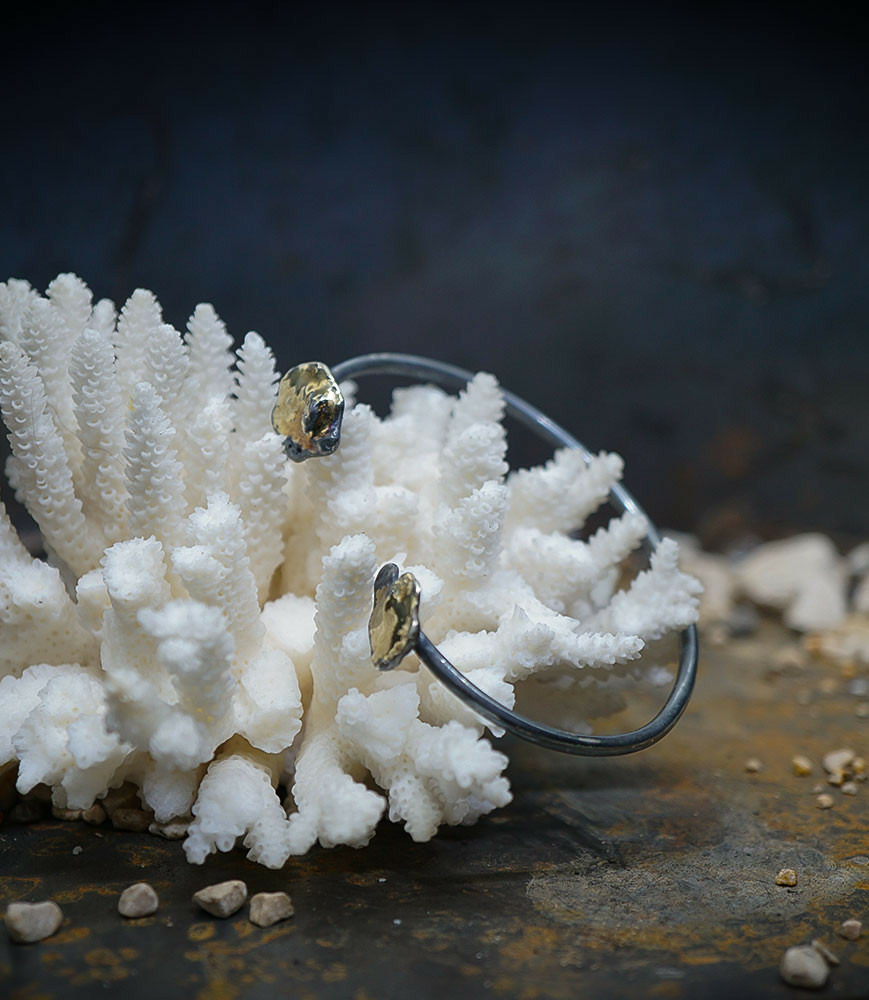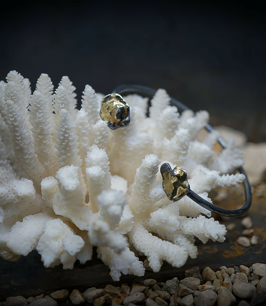 Ses bijoux, souvent réalisés en argent, mettent en avant des textures contrastées, avec des finitions lisses et martelées, évoquant un parfait équilibre entre force et finesse.