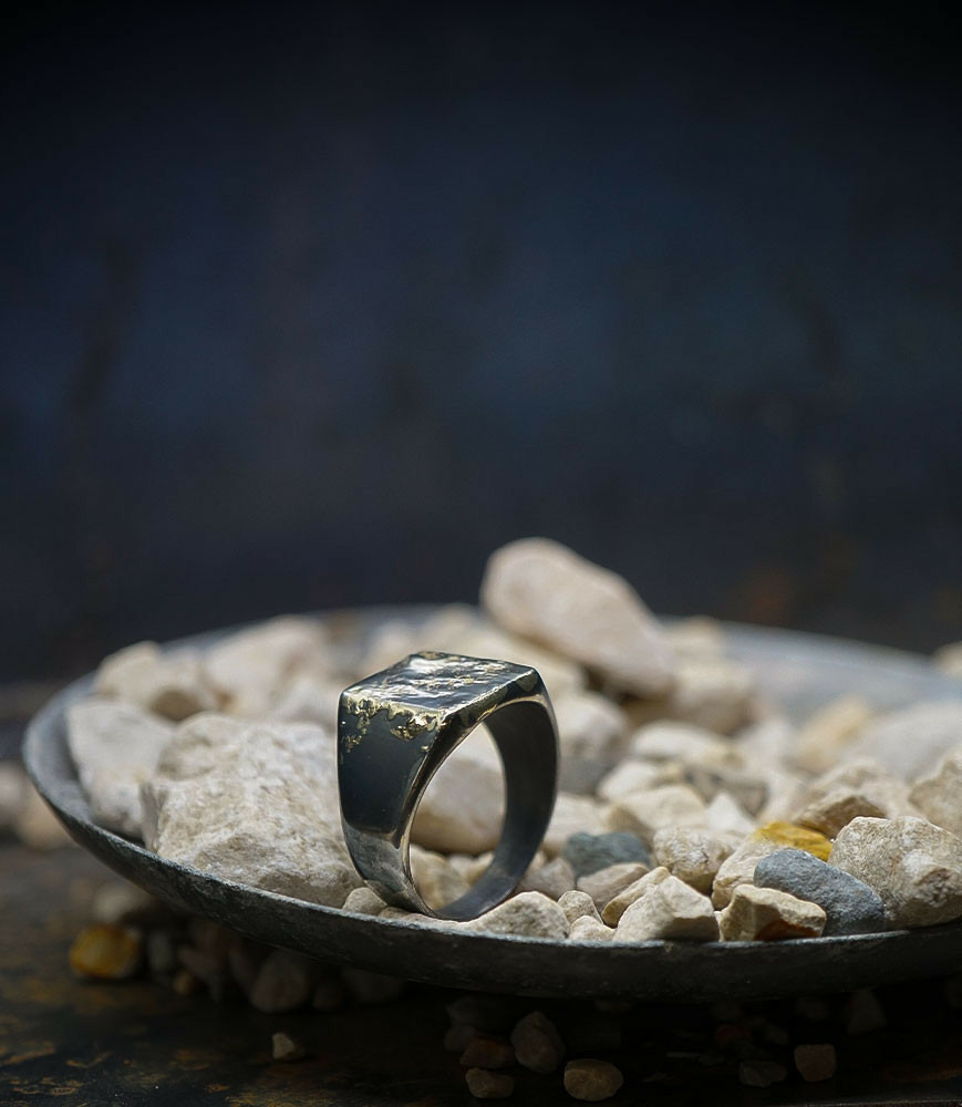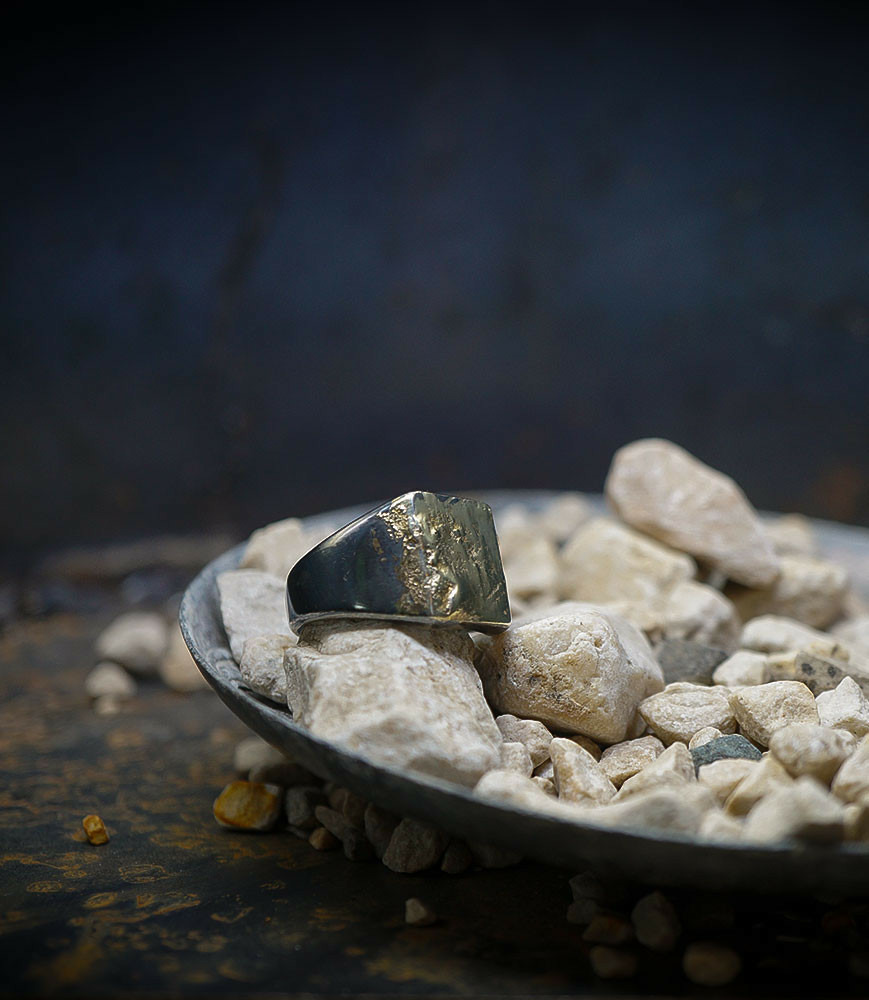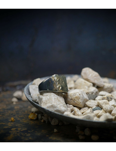 L'argent et l'or subit un traitement brutal, rude, le résultat après polissage des bagues, bracelets, colliers, bruts, singuliers et harmonieux.