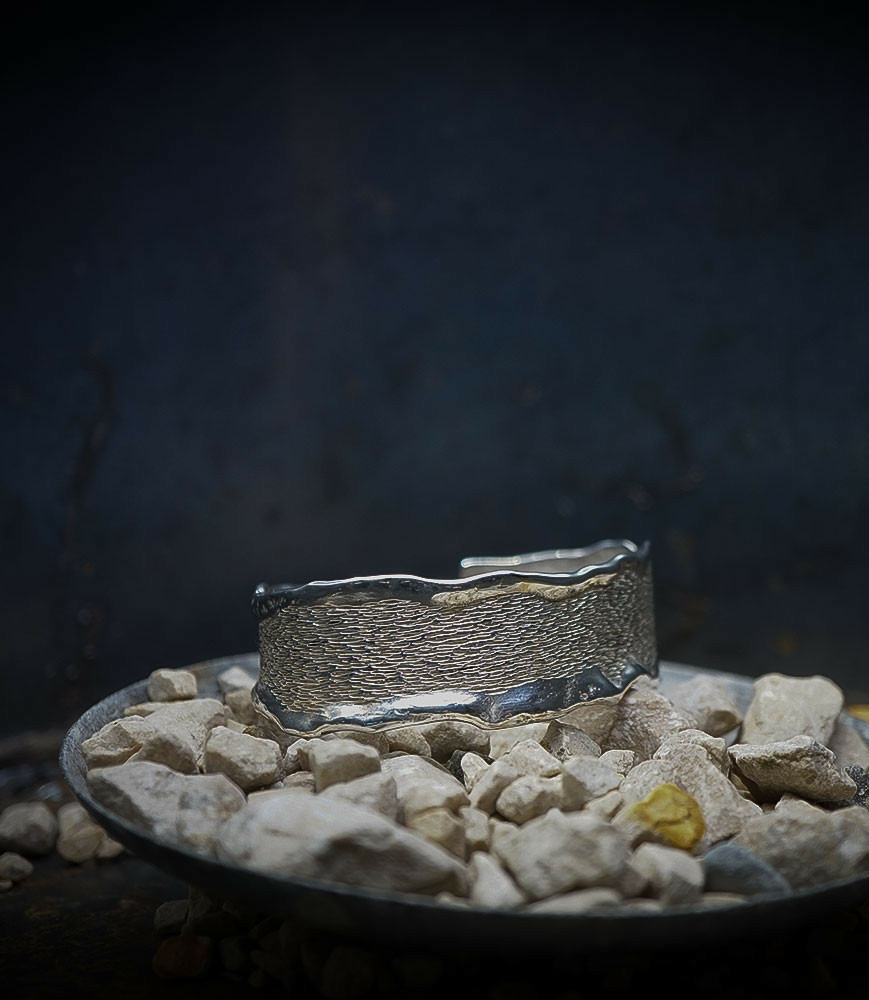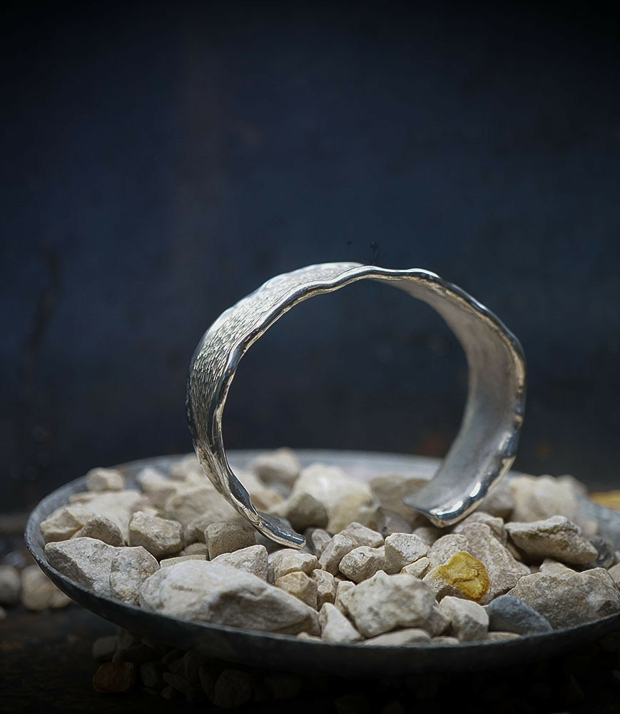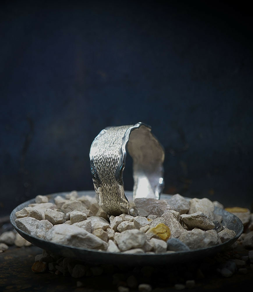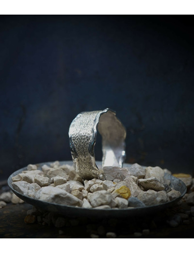 Ses bijoux, souvent réalisés en argent, mettent en avant des textures contrastées, avec des finitions lisses et martelées, évoquant un parfait équilibre entre force et finesse.