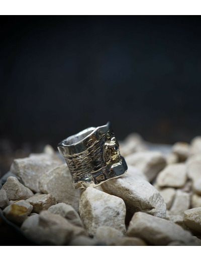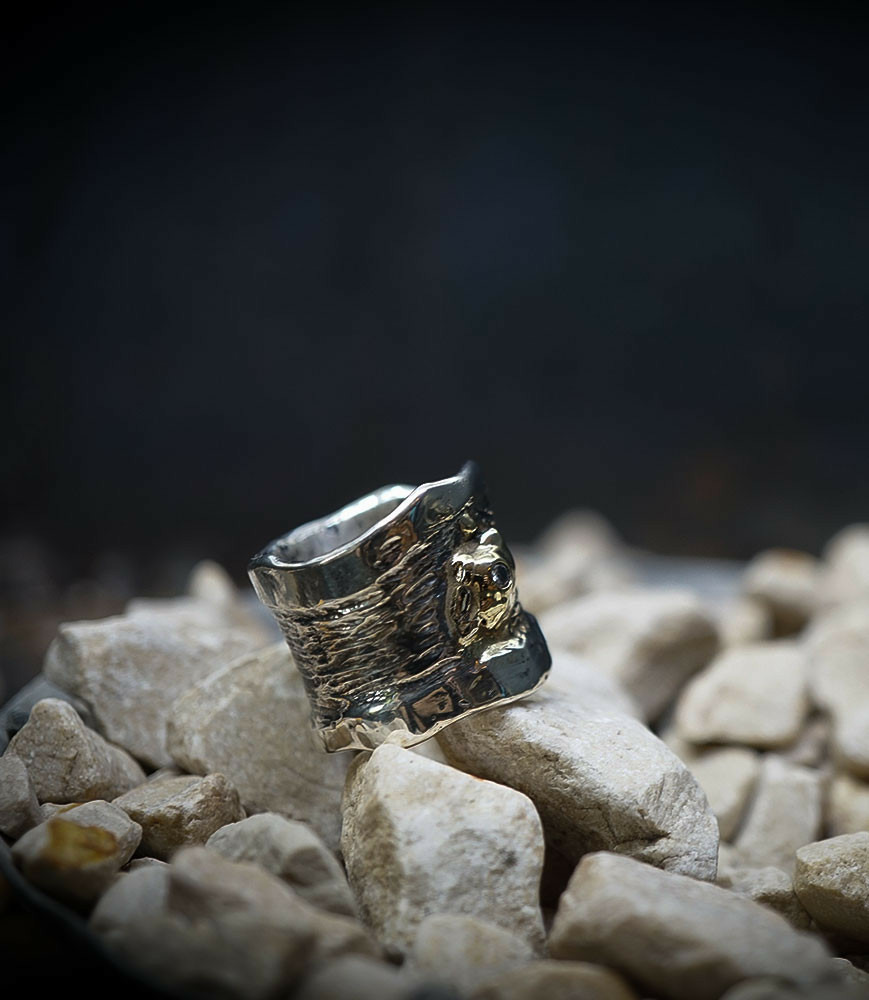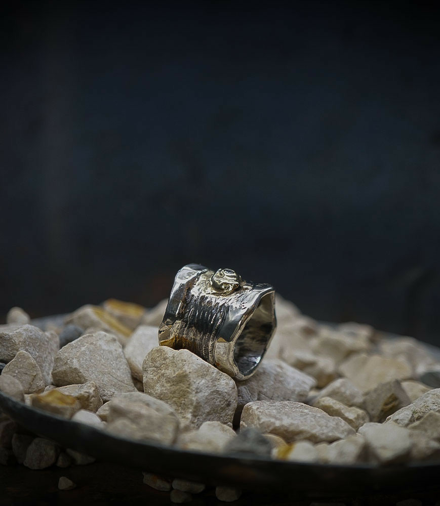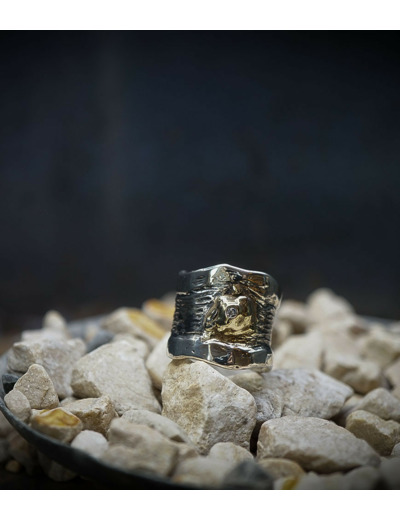 Valentine pour cette collection de bagues utilise une seule pièce d'argent au titre légal 925/1000 par création, qu'elle associe parfois à de la "côte de maille" en argent 925/1000. elle peut aussi sertir des pierres fines ou précieuses sur certaines pièces, en repliant simplement les bords de la bague sur le minéral.