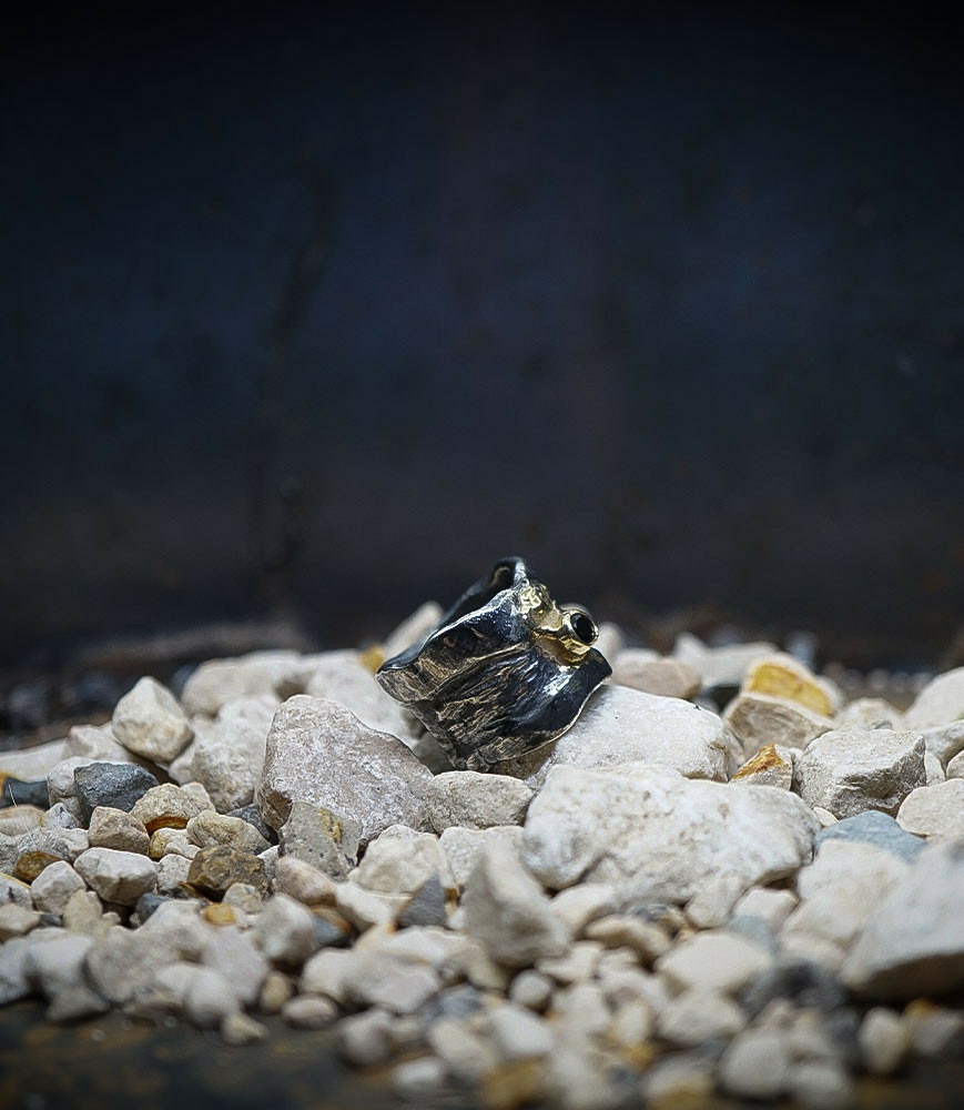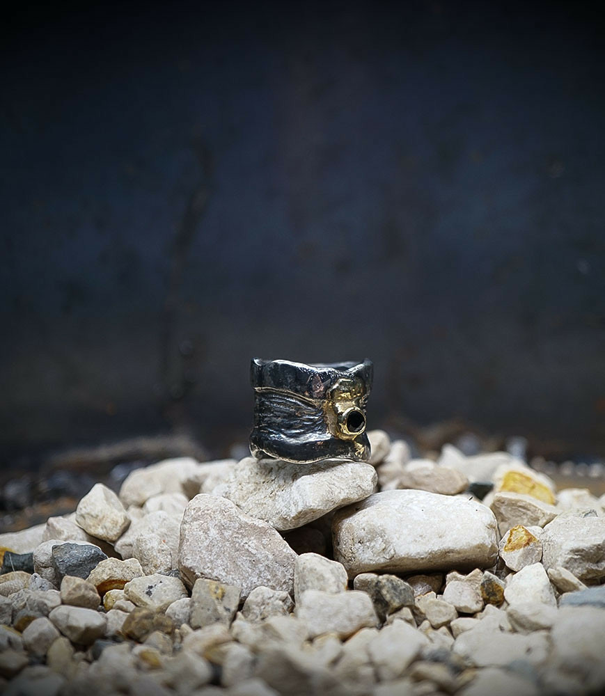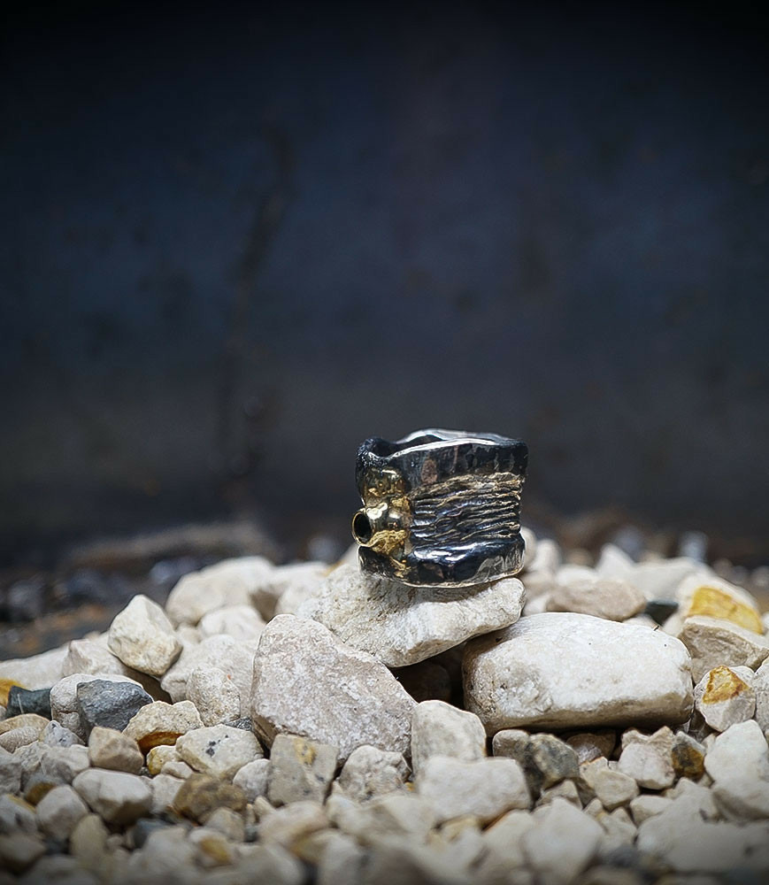 Valentine pour cette collection de bagues utilise une seule pièce d'argent au titre légal 925/1000 par création, qu'elle associe parfois à de la "côte de maille" en argent 925/1000. elle peut aussi sertir des pierres fines ou précieuses sur certaines pièces, en repliant simplement les bords de la bague sur le minéral.