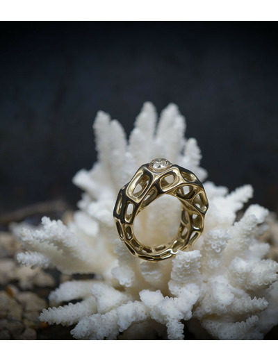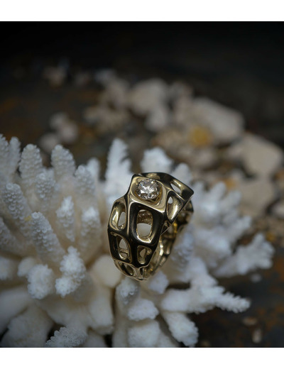 Le design elliptique de la bague offre une allure moderne et élégante. Ce qui rend cette bague particulière, c'est son motif ajouré en nid d'abeille. Cette technique de conception permet à la lumière de traverser la structure, créant des jeux de lumière captivants qui mettent en valeur l'éclat de la pierre.
