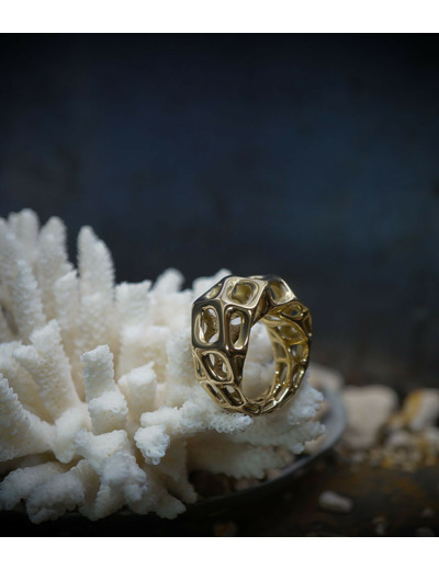 Le design elliptique de la bague offre une allure moderne et élégante. Ce qui rend cette bague particulière, c'est son motif ajouré en nid d'abeille. Cette technique de conception permet à la lumière de traverser la structure, créant des jeux de lumière captivants.