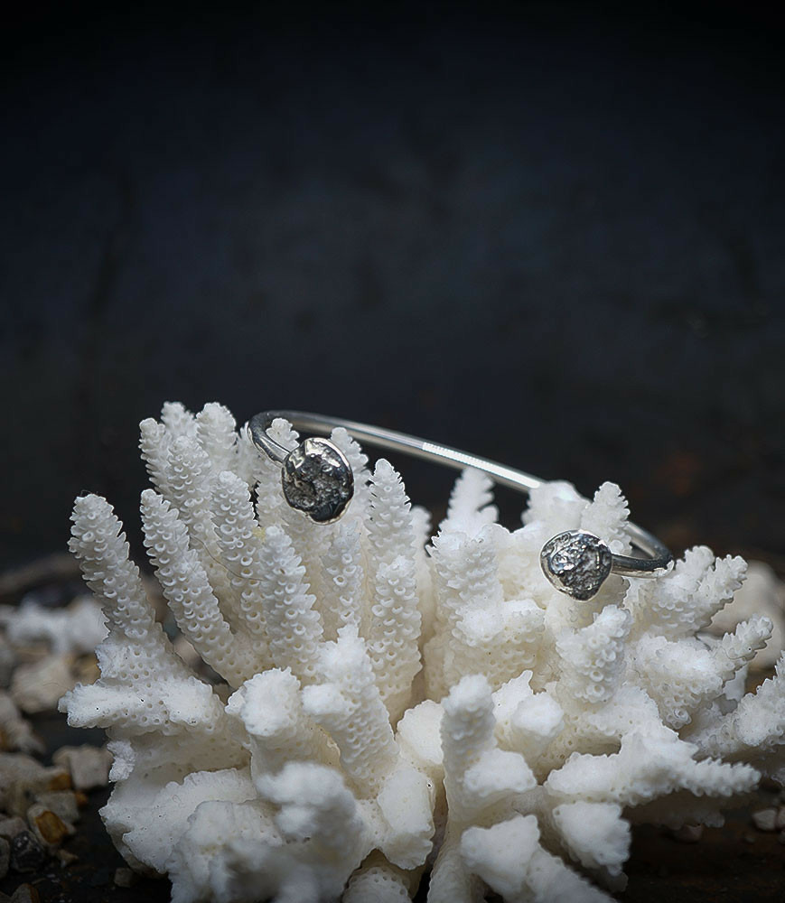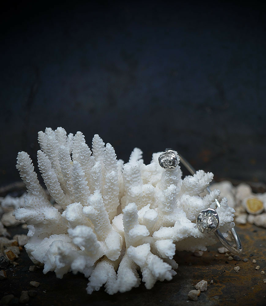 Ses bijoux, souvent réalisés en argent, mettent en avant des textures contrastées, avec des finitions lisses et martelées, évoquant un parfait équilibre entre force et finesse.