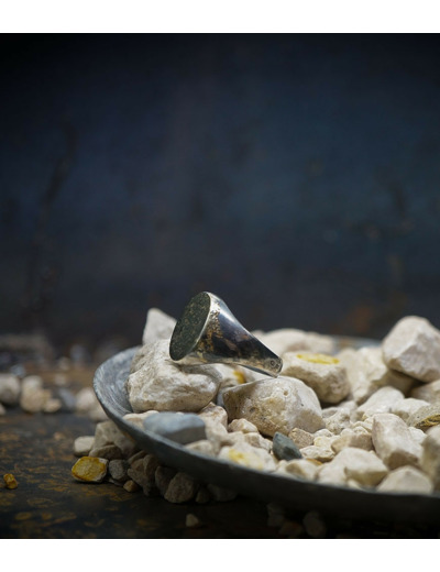 Parfois les stries dans le métal de la bague rappellent la superposition des couches sédimentaires géologiques que l'on peut observer dans les roches.