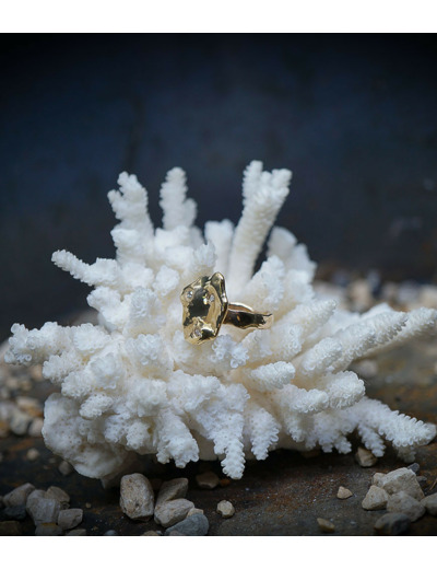 Elle travaille l'or et l'argent de manière organique, privilégiant des textures et des formes irrégulières, inspirées par la nature.