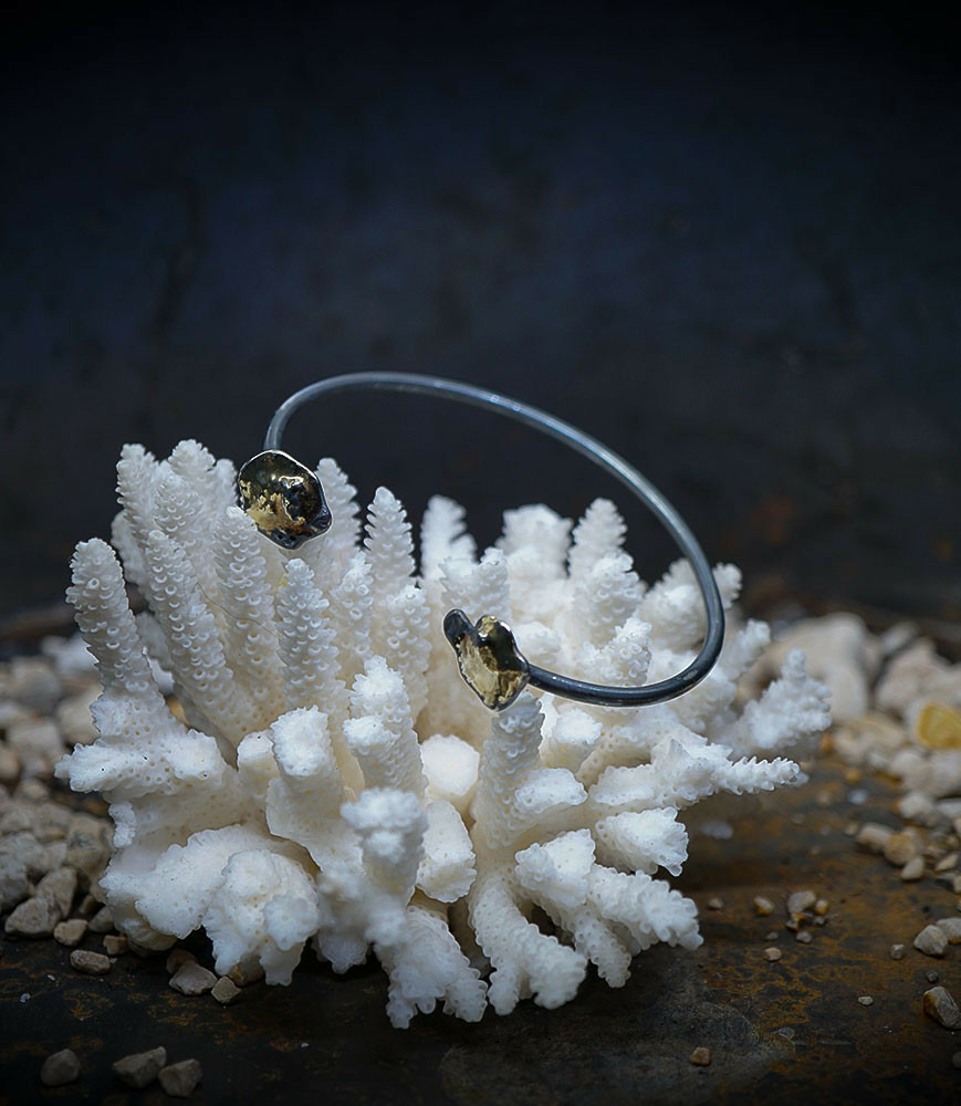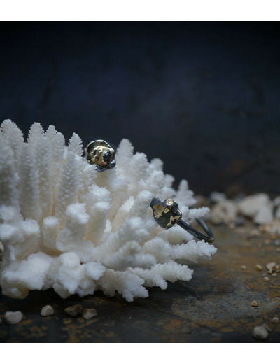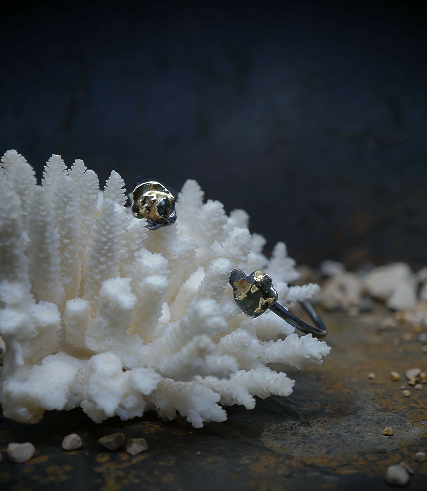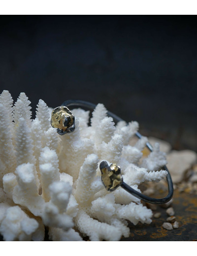 Ses bijoux, souvent réalisés en argent, mettent en avant des textures contrastées, avec des finitions lisses et martelées, évoquant un parfait équilibre entre force et finesse.